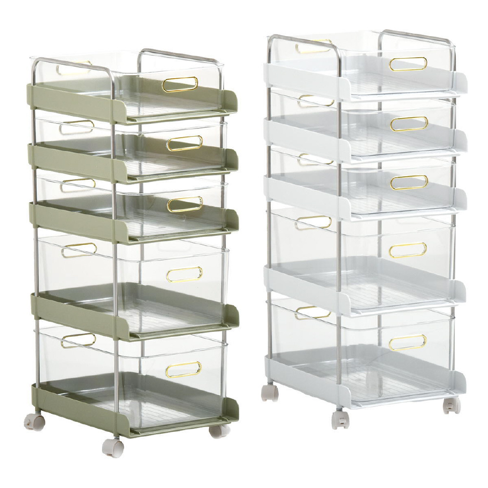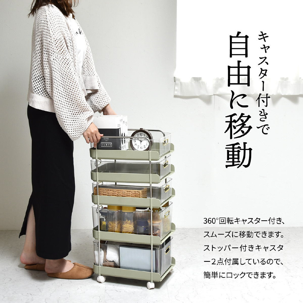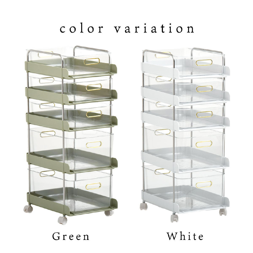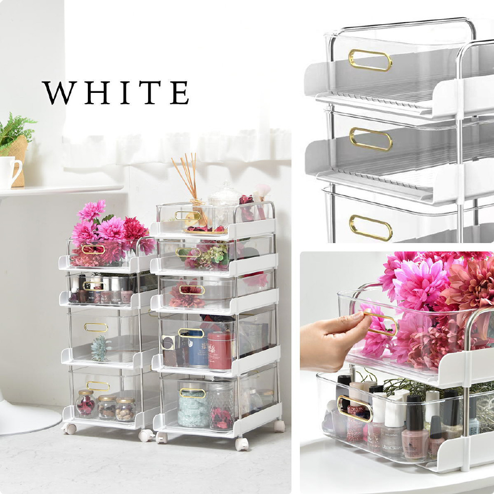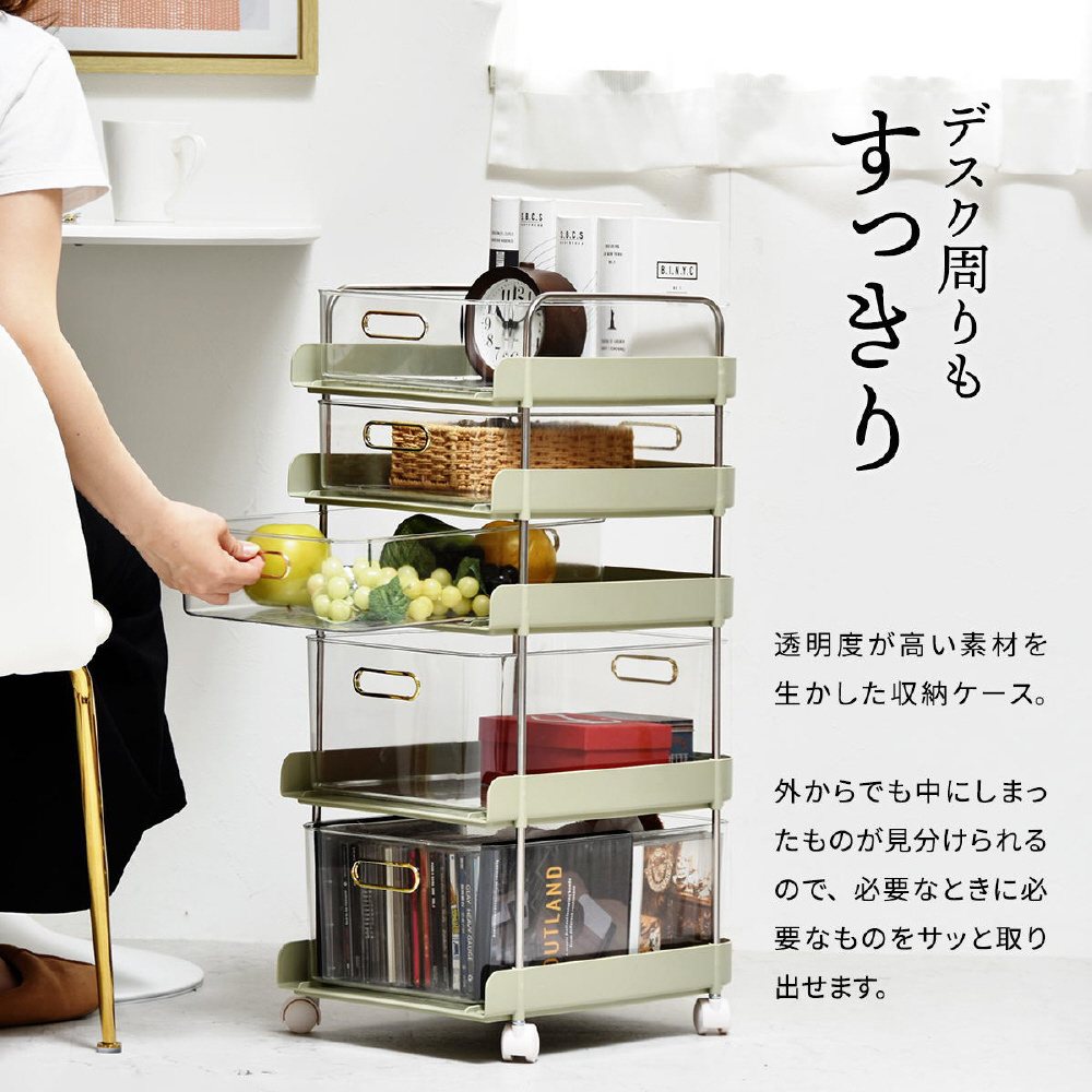 工具が必要なく挿し込むだけで組立が完成するフェミニワゴン。引出が透明なのでどこに何が入っているかわかりやすくて便利。棚部分のくすみカラーと、ゴールド取手の組み合わせが、フェミニンでかわいらしいいデザインに仕上がっています。