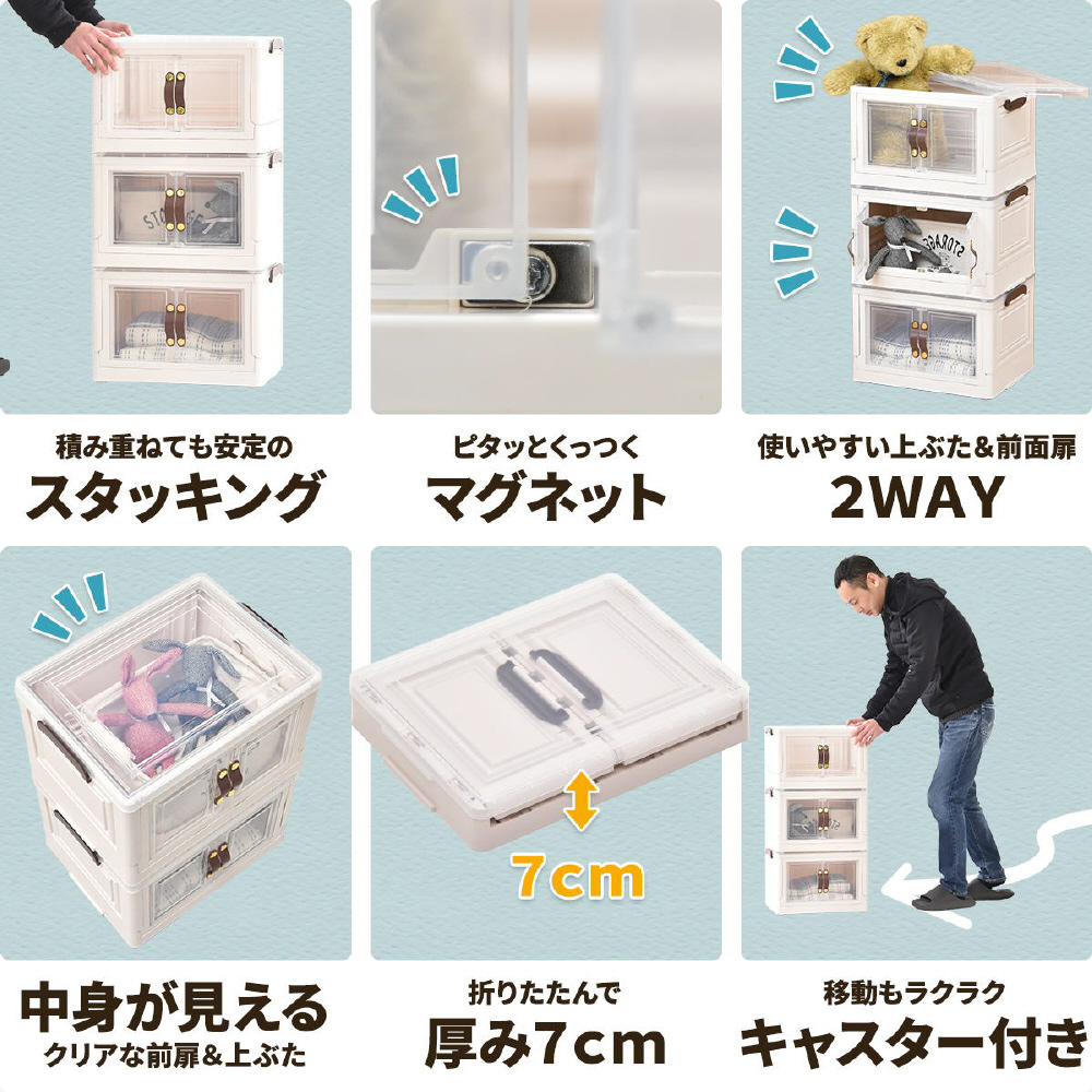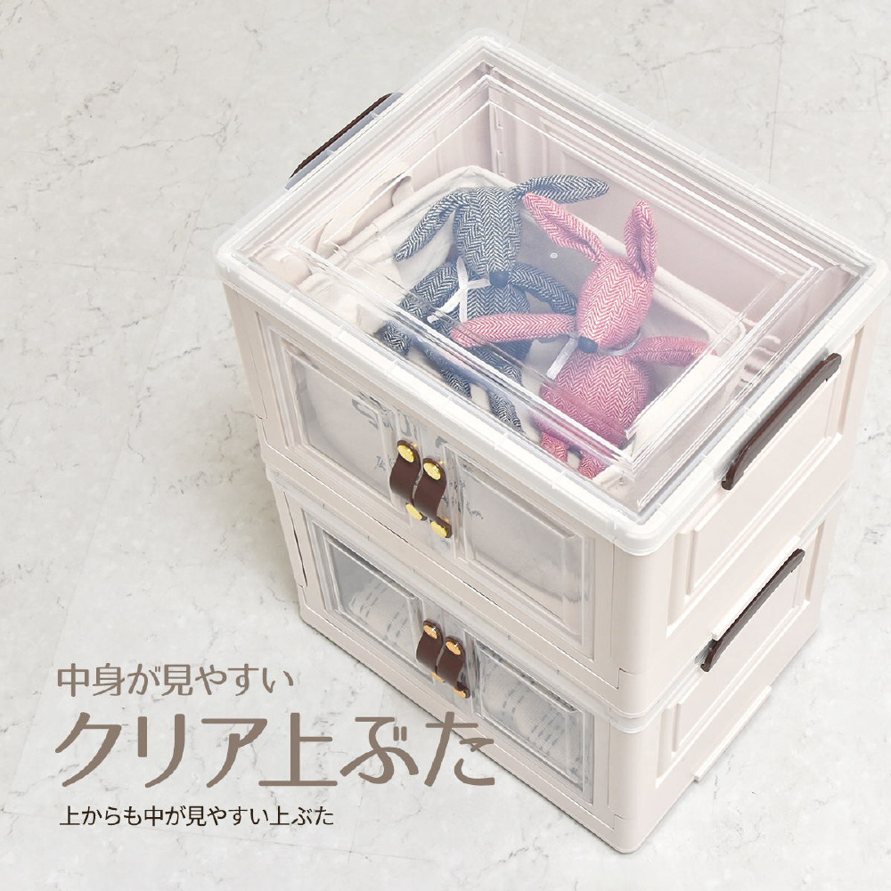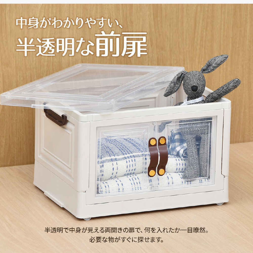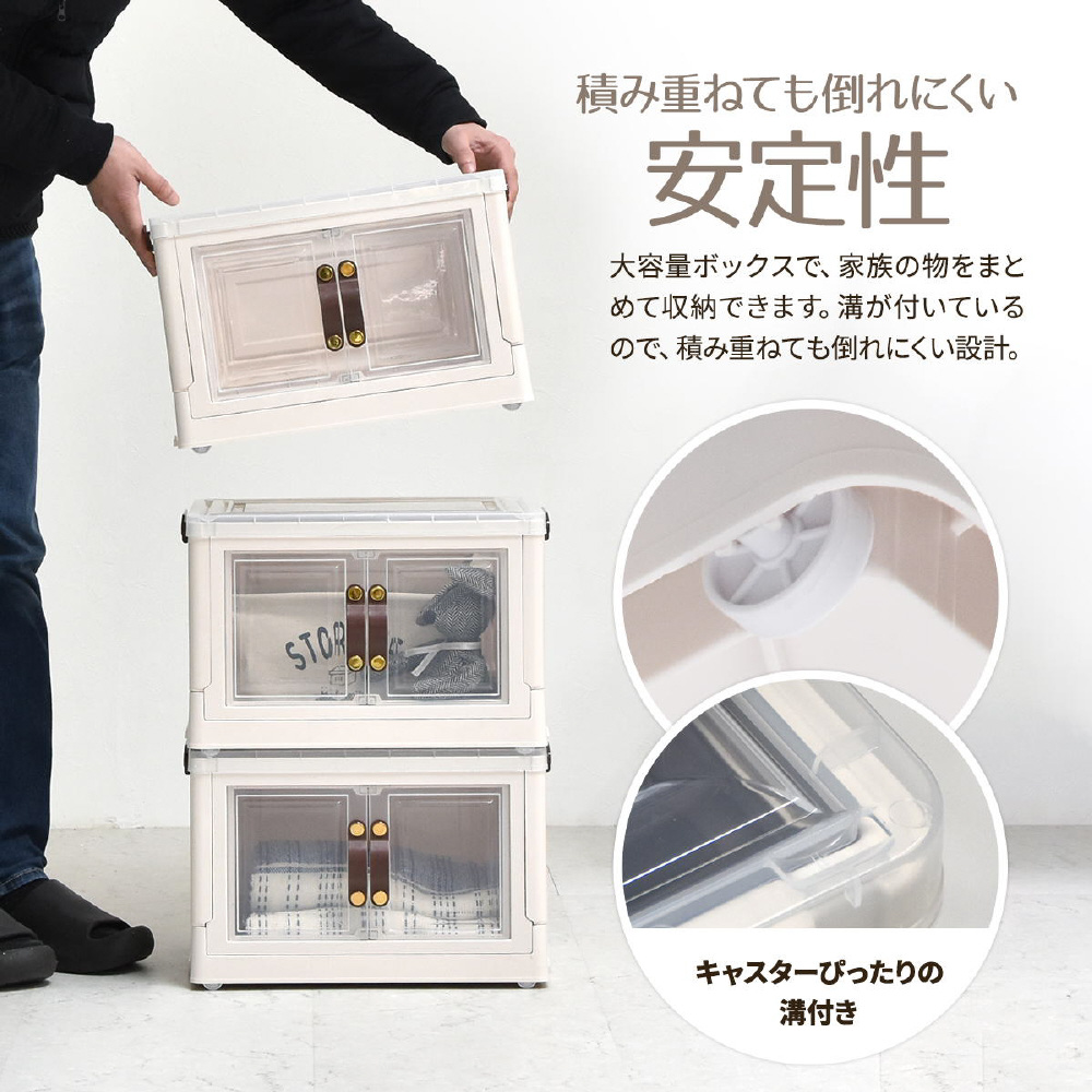 半透明で中身が見える可愛い収納ボックス。底部分にはキャスターがついており、移動が楽なのでお掃除する時にも便利です。また積み重ねができる仕様になっているので、お部屋のスペースやご利用になりたい容量などに合わせて積み重ねてお使いいただける点や、天板と前扉が半透明なので中身がすぐわかるという点もおすすめです。