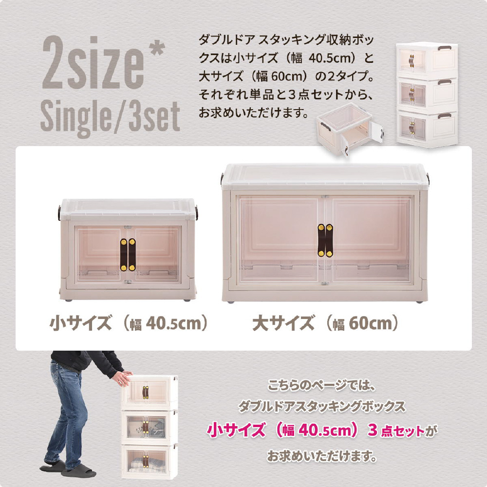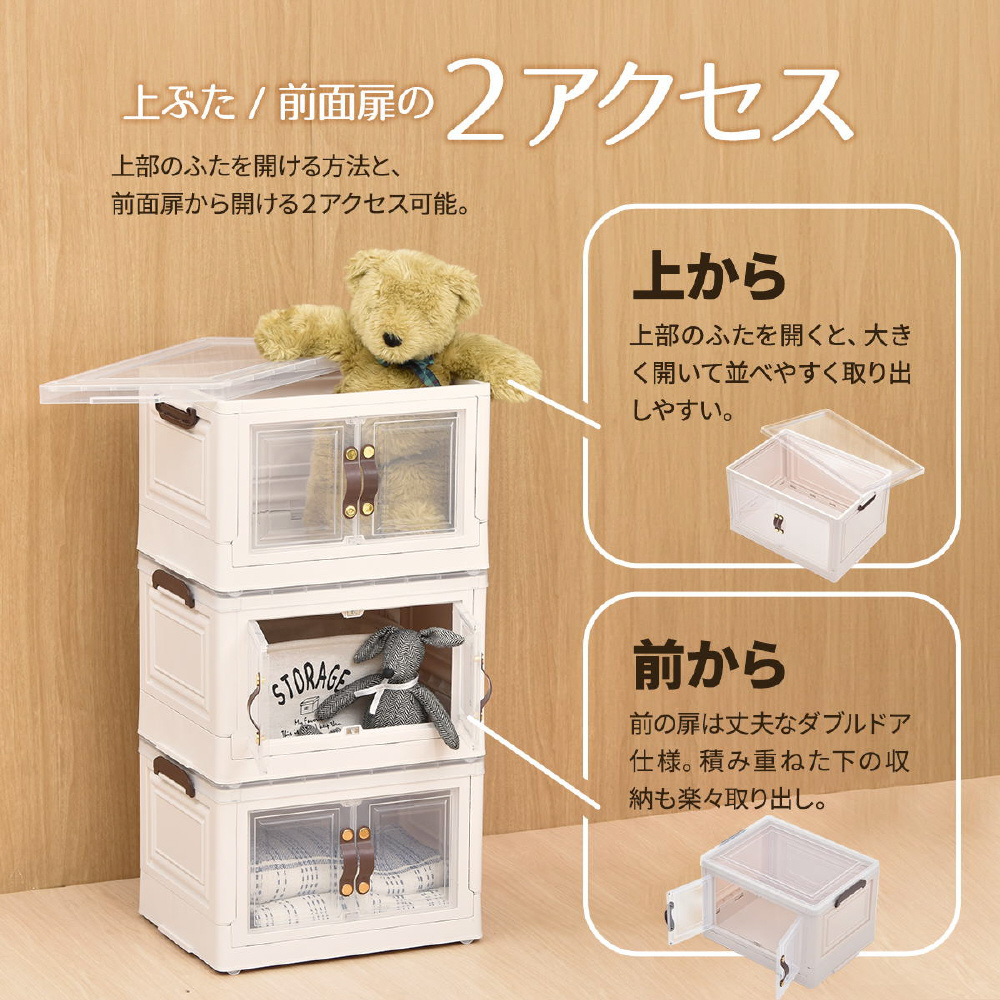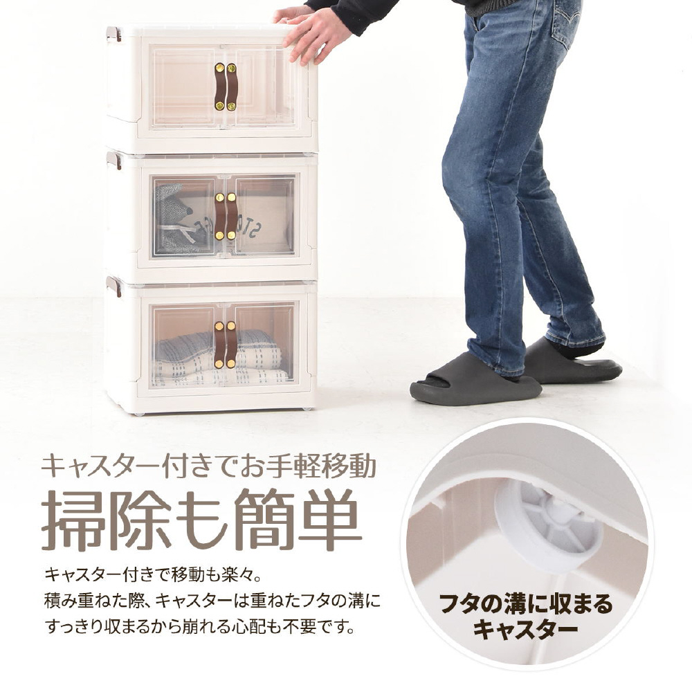 半透明で中身が見える可愛い収納ボックス。底部分にはキャスターがついており、移動が楽なのでお掃除する時にも便利です。また積み重ねができる仕様になっているので、お部屋のスペースやご利用になりたい容量などに合わせて積み重ねてお使いいただける点や、天板と前扉が半透明なので中身がすぐわかるという点もおすすめです。
