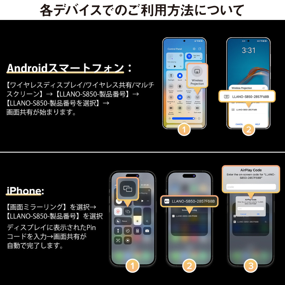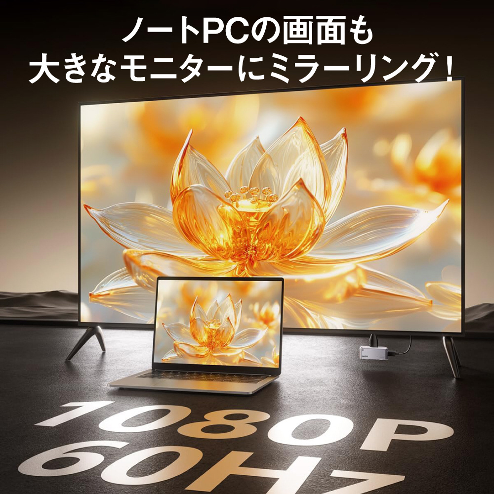 スマホやタブレットなどの画面をテレビ・モニターなどの大画面にワイヤレスで表示できる送受信機