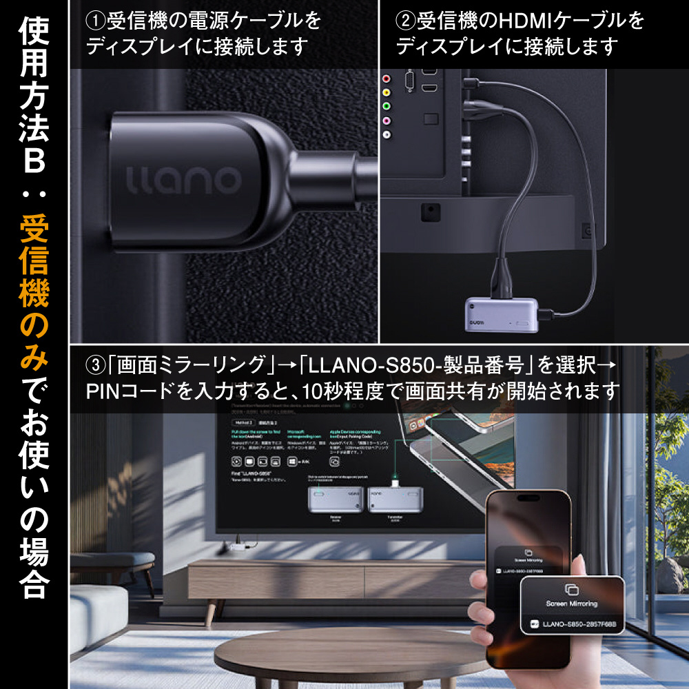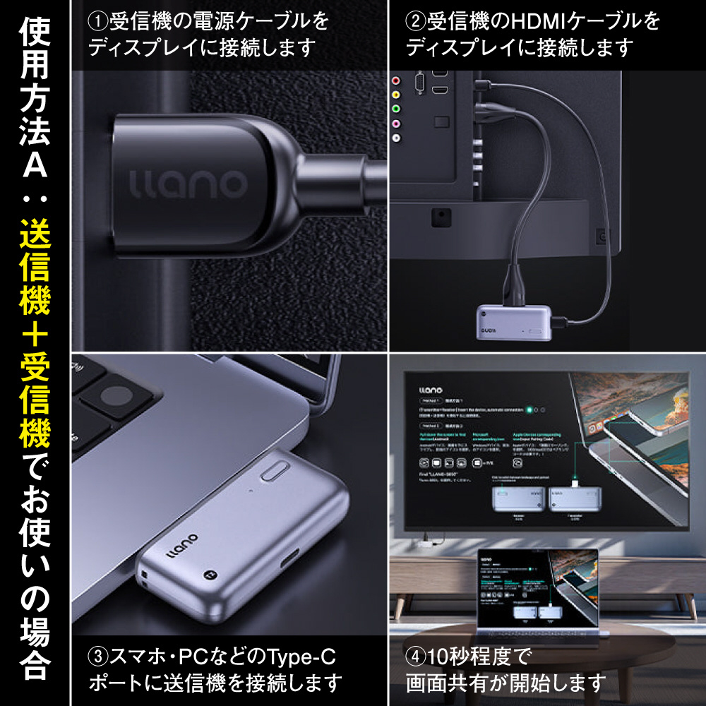 従来の送受信機モードに加え、llanoのhdmi 無線製品は受信機のみで簡単にミラーリングができる新機能を搭載。よりシンプルで使いやすくなりました。