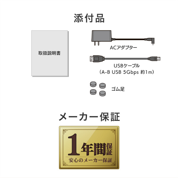 | 付属品 | USBケーブル(A-B USB 5Gbps 約1m)、ACアダプター、ゴム足、取扱説明書 |
