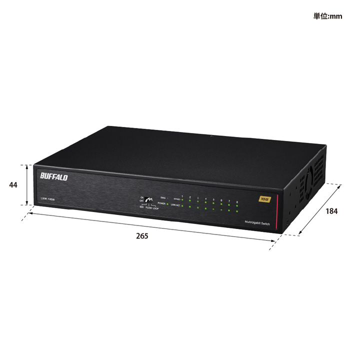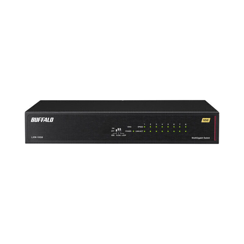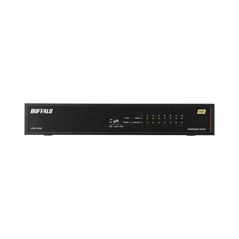 全ポートが10Gbpsに対応したスイッチングハブです。10G インターネット回線をご利用の環境で、10GBASE-T/5GBASE-T/2.5GBASE-T対応のパソコンやNASなどを複数台接続することが可能となり、高速インターネットを活用した10Gネットワーク環境を構築することができます。