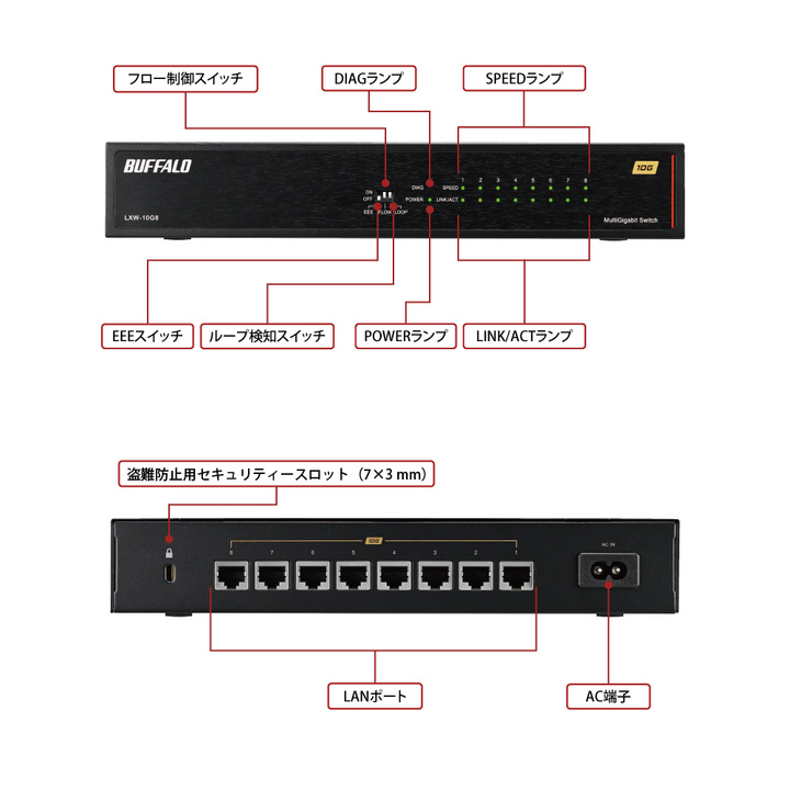 10Gインターネット回線・10G対応ルーター/HGW(ホームゲートウェイ)や、10GBASE-T/5GBASE-T/2.5GBASE-T対応のパソコン・NAS・有線LANアダプターなど、10GBASE-Tおよび5GBASE-T/2.5GBASE-Tに対応したLANポートを8ポート備えた本製品があれば10Gネットワーク環境を構築可能です。