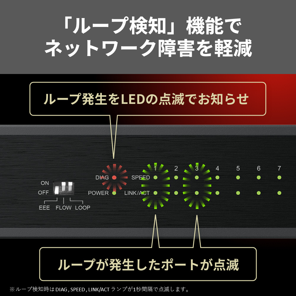 障害を発?させるループ構成を検知し、発?ポートをランプでお知らせ。障害解消に役?ちます。(出荷時はオン)