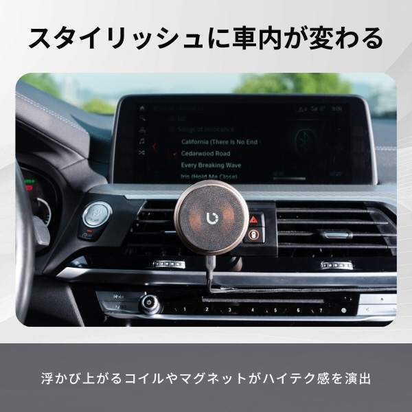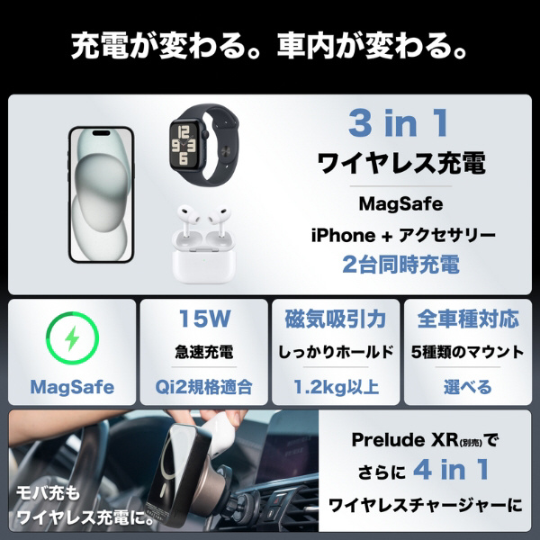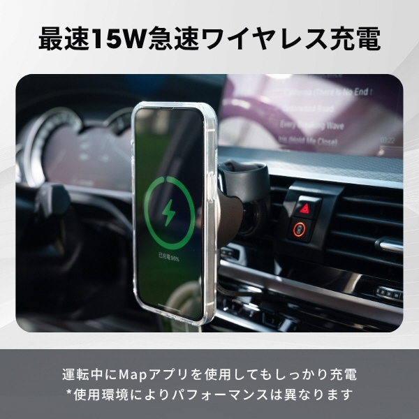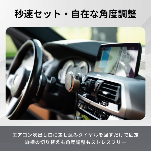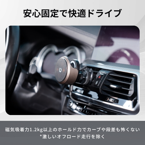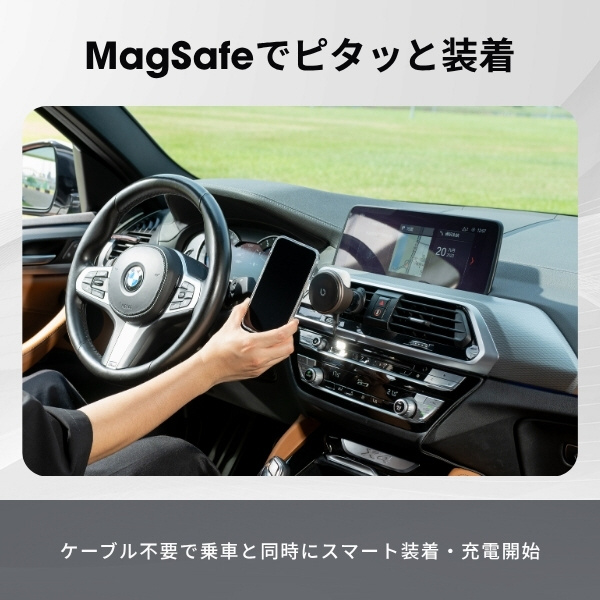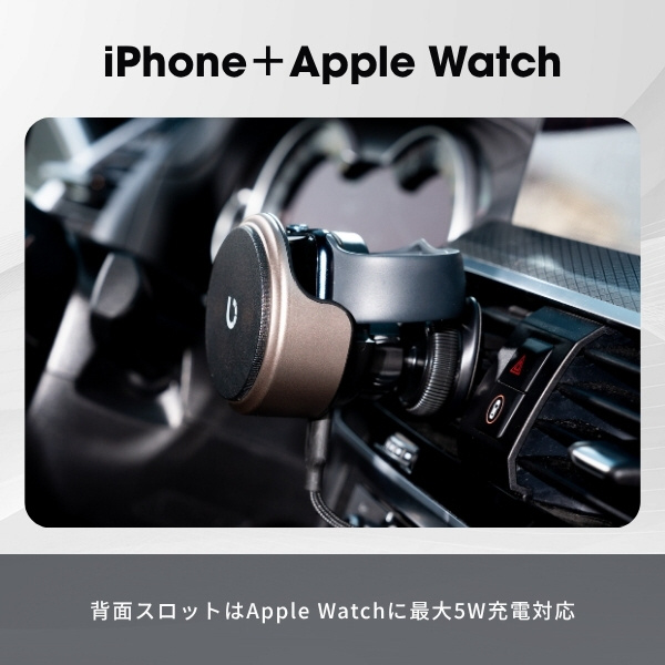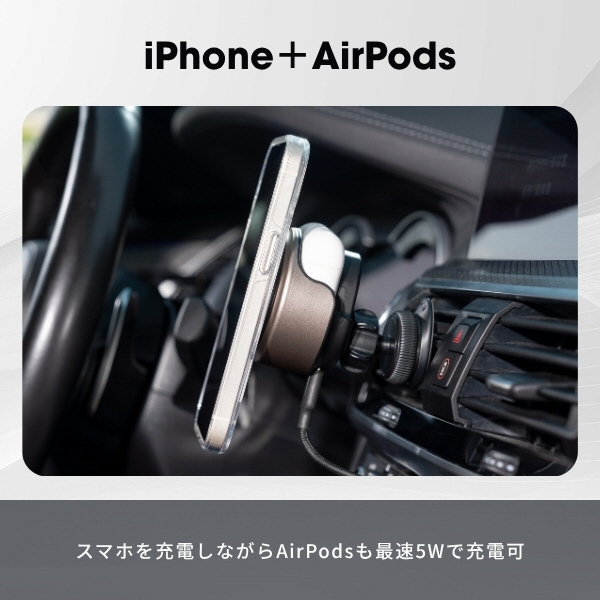 MagSafe対応スマホとApple WatchまたはAirPodsを車内で同時にワイヤレス充電可能。エアコン吹き出し口取り付け型で、乗り降り時もケーブル不要で瞬時にピタッと充電開始。洗練されたデザインで車内をスタイリッシュに整えます。