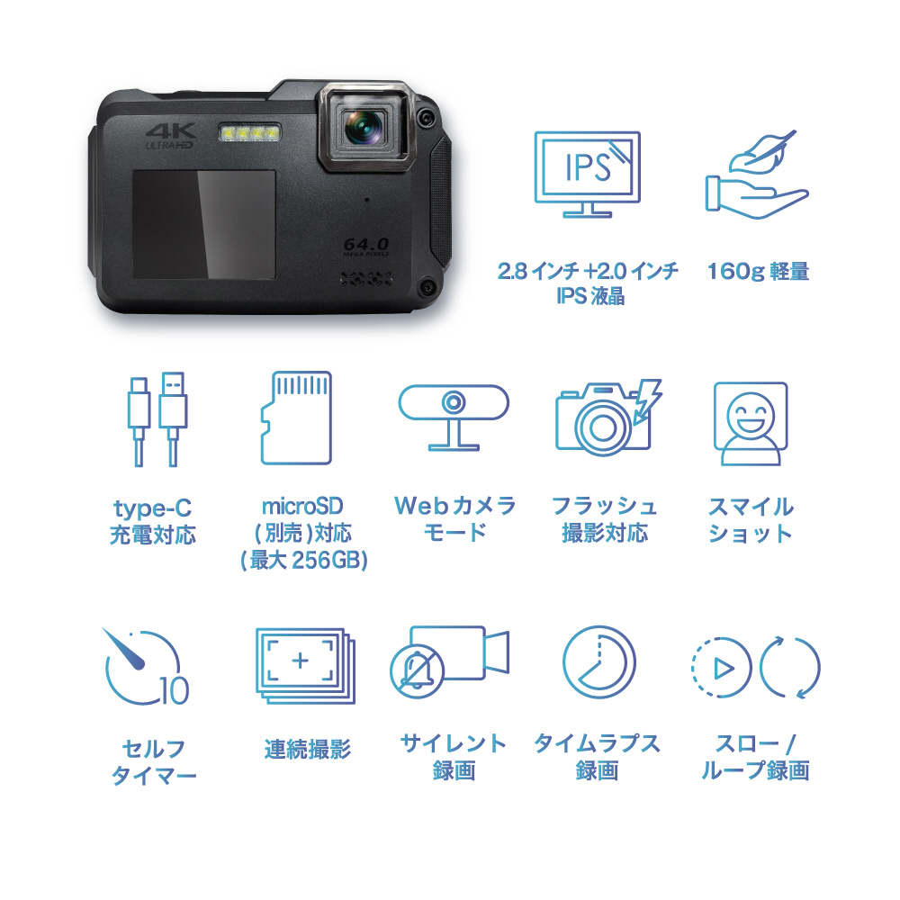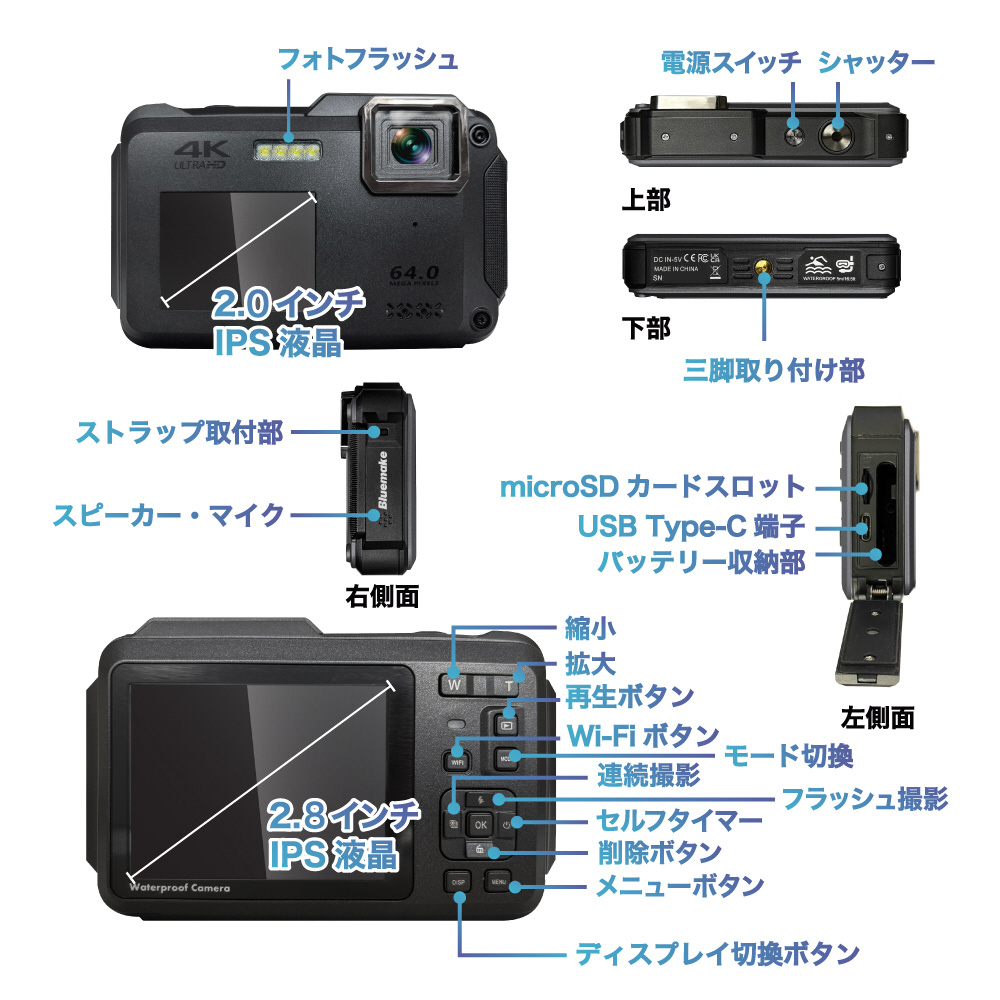 | 商品名 | CALSモード対応 防水コンパクトデジタルカメラ Bluemake TT-WD13CB ブラック |