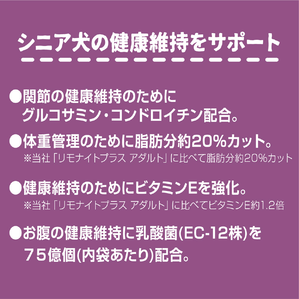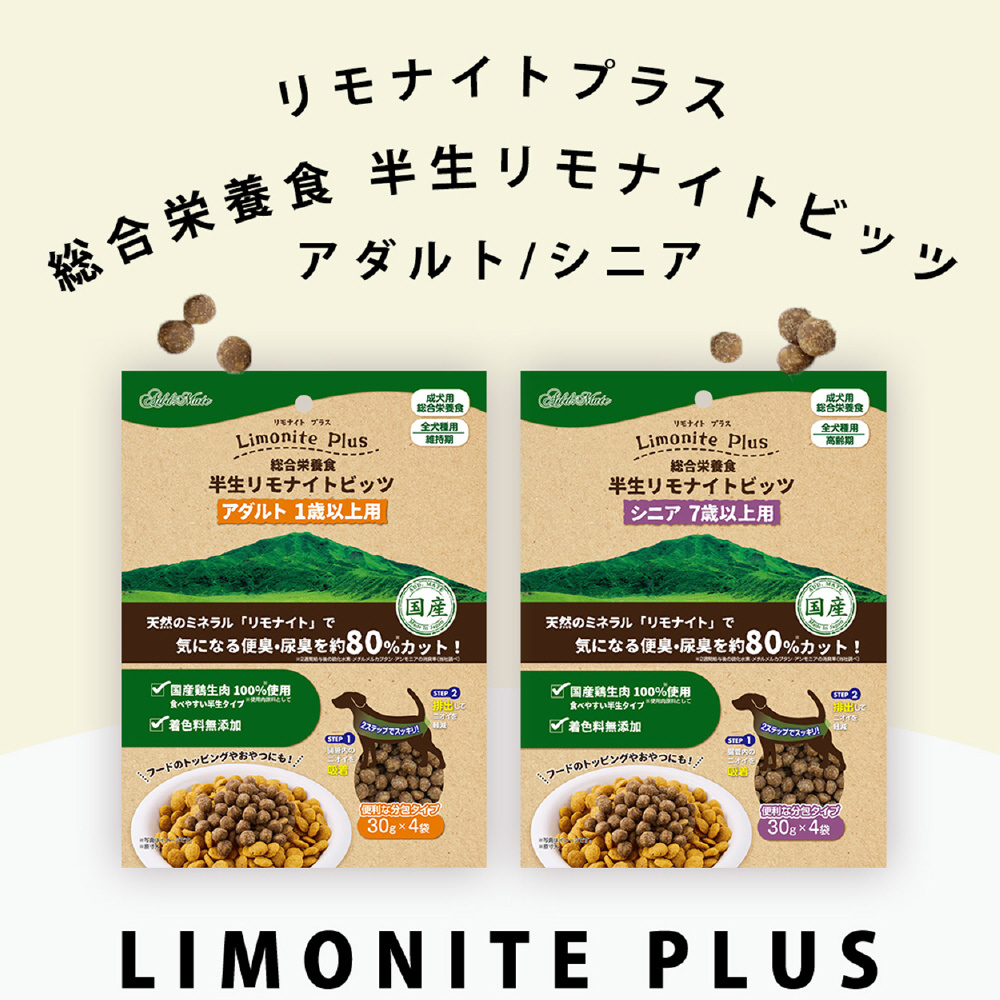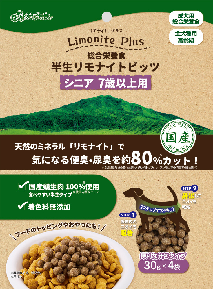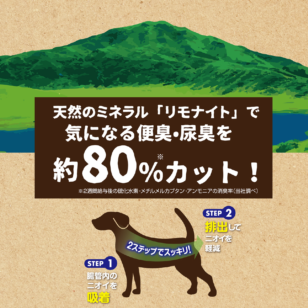 阿蘇の天然ミネラル「リモナイト」が便臭・尿臭を吸着し、気になるニオイを約80%カット!シニア犬の健康を考えた栄養バランスと機能性成分配合。