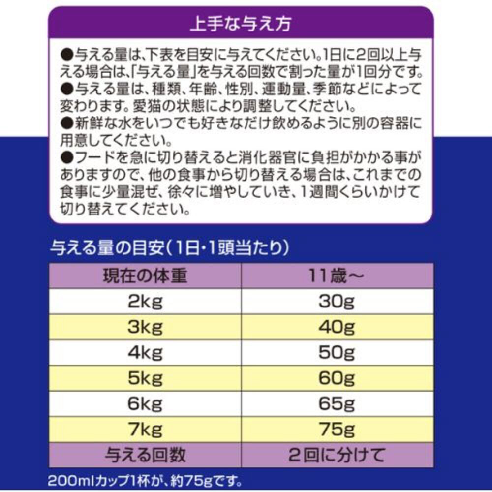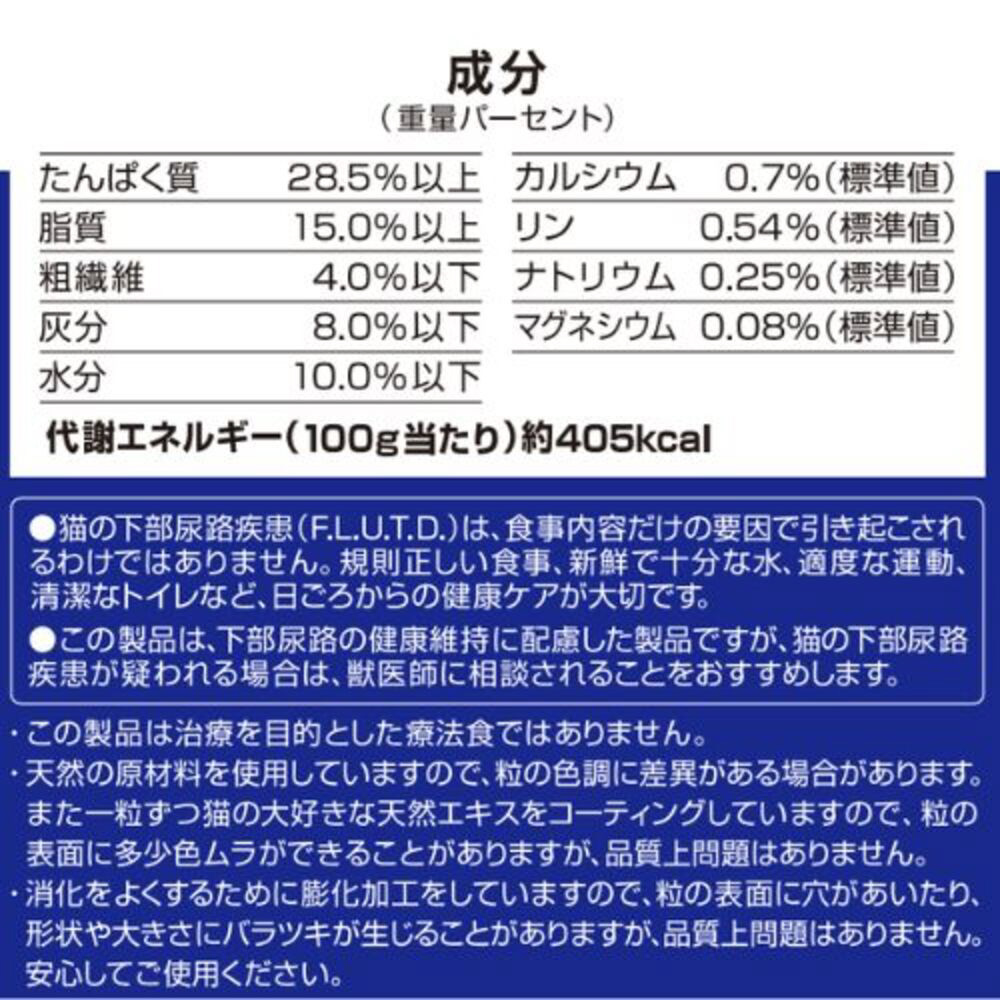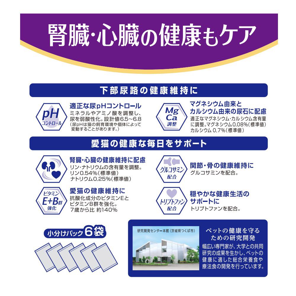 【無着色】この製品は、ペットフード公正取引協議会の定める分析試験の結果、「総合栄養食/成猫期用」の基準を満たすことが証明されています。■適正な尿pHコントロール◇ミネラルやアミノ酸を調整し、尿を弱酸性化。◎設計値6.5〜6.8(尿pHは猫の飼育環境や個体によって変動することがあります。)■マグネシウム由来とカルシウム由来の尿石に配慮◇適正なマグネシウム・カルシウム含有量に調整。◎マグネシウム 0.08%(標準値)◎カルシウム 0.7%(標準値)■腎臓・心臓の健康維持に配慮◇リン・ナトリウムの含有量を調整。◎リン 0.54%(標準値)◎ナトリウム 0.25%(標準値)■関節・骨の健康維持に◇グルコサミンを配合。■愛猫の健康維持に◇抗酸化成分のビタミンEとビタミンB群を強化。◎7歳から比 約140%■穏やかな健康生活のサポートに◇トリプトファンを配合。