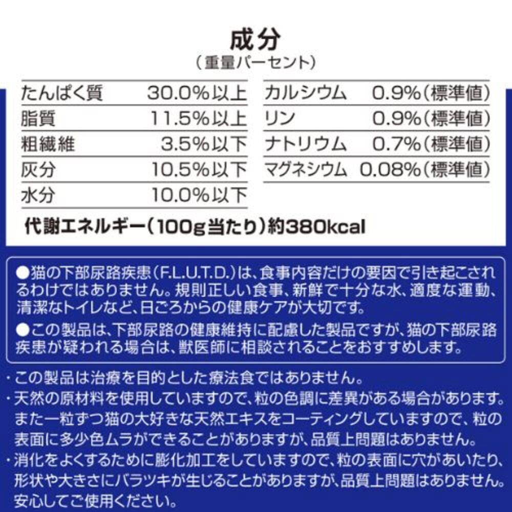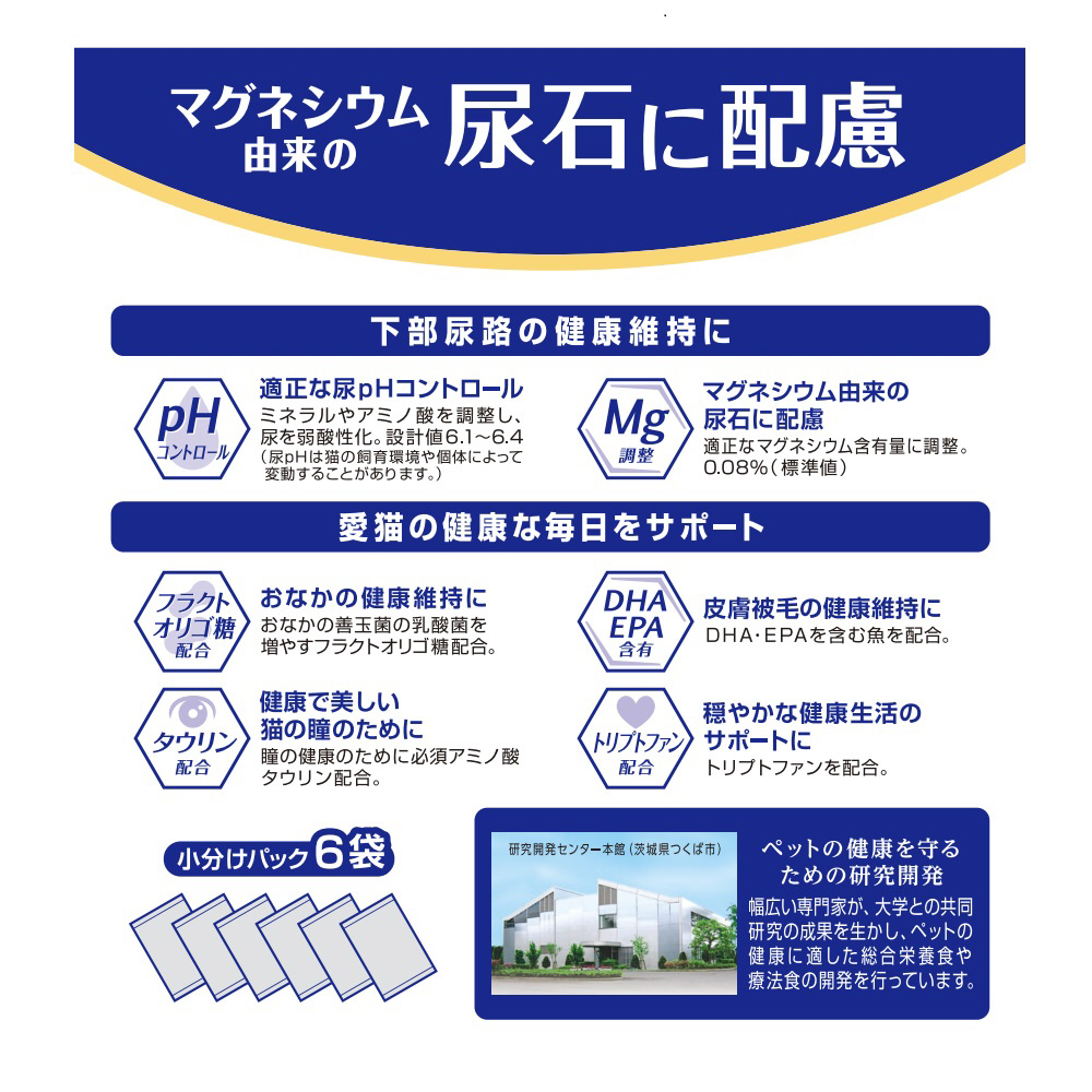 【無着色】この製品は、ペットフード公正取引協議会の定める分析試験の結果、「総合栄養食/成猫期用」の基準を満たすことが証明されています。■適正な尿pHコントロール◇ミネラルやアミノ酸を調整し、尿を弱酸性化。◎設計値6.1〜6.4(尿pHは猫の飼育環境や個体によって変動することがあります。)■マグネシウム由来の尿石に配慮◇適正なマグネシウム含有量に調整。◎マグネシウム 0.08%(標準値)■おなかの健康維持に◇おなかの善玉菌の乳酸菌を増やすフラクトオリゴ糖を配合。■皮膚被毛の健康維持に◇DHA・EPAを含む魚を配合。■健康で美しい猫の瞳のために◇瞳の健康のために必須アミノ酸タウリンを配合。■穏やかな健康生活のサポートに◇トリプトファンを配合。
