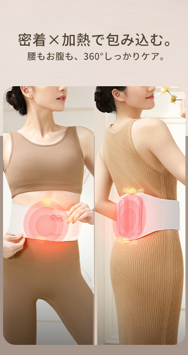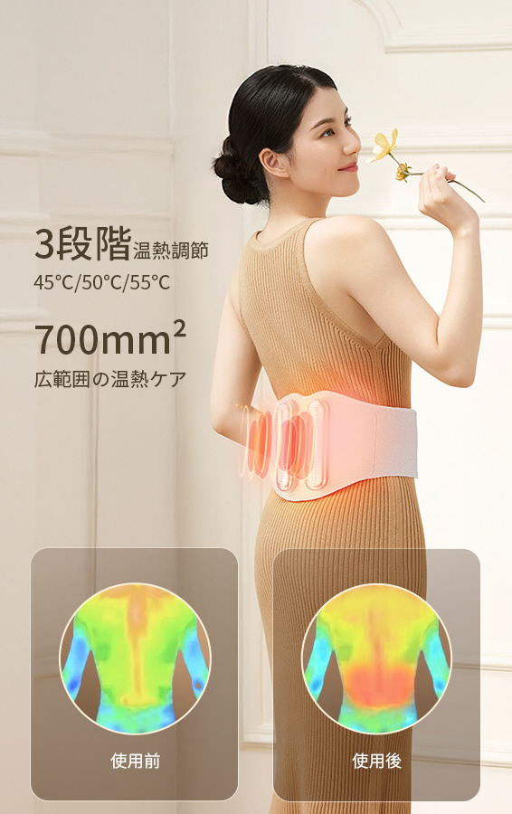 3段階の温度設定が可能で、左右14900mの広範囲な加熱エリアで腰と腹部をしっかりと温めて快適にします。