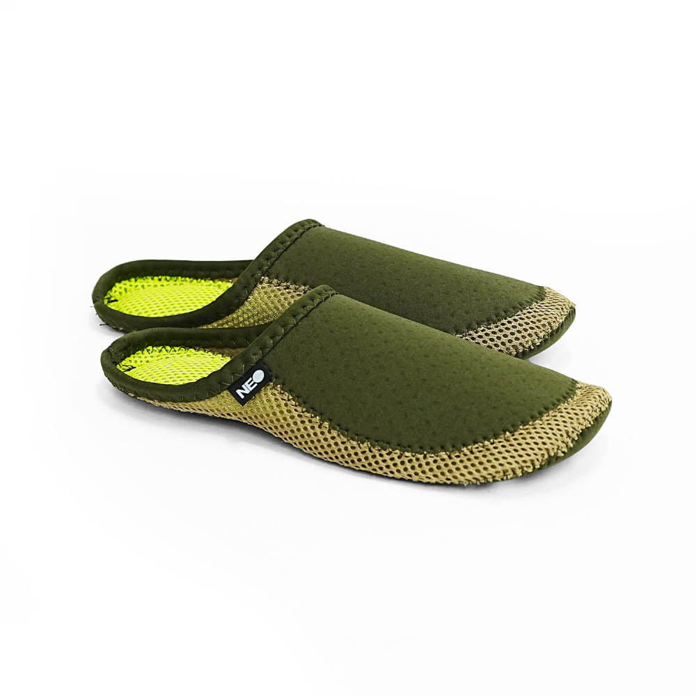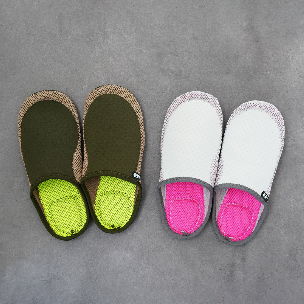 Mサイズ:23-25cm。素材:クロロプレンゴム。ウェットスーツで使われている、伸縮性、耐衝撃性に優れたクロロプレンゴムを使った、新感覚のNEOスリッパ。存在感のあるカラーリング、フィット感と弾力感が特長で、丸洗いも可能。パッケージがそのまま収納袋になっているので、自宅用はもちろん、旅先や、機内、授業参観などのイベントetc ... 様々な場面で活躍してくれます。