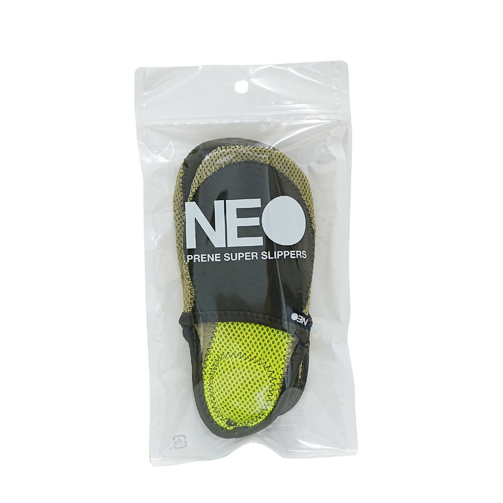 Lサイズ:26-28cm。素材:クロロプレンゴム。ウェットスーツで使われている、伸縮性、耐衝撃性に優れたクロロプレンゴムを使った、新感覚のNEOスリッパ。存在感のあるカラーリング、フィット感と弾力感が特長で、丸洗いも可能。パッケージがそのまま収納袋になっているので、自宅用はもちろん、旅先や、機内、授業参観などのイベントetc ... 様々な場面で活躍してくれます。