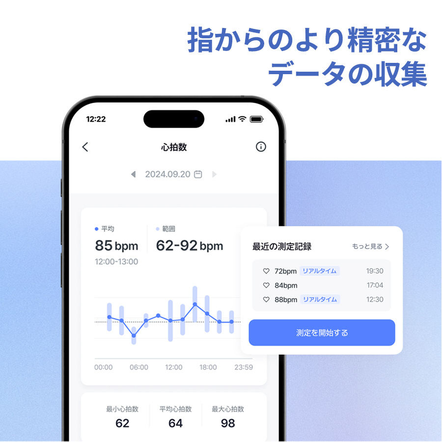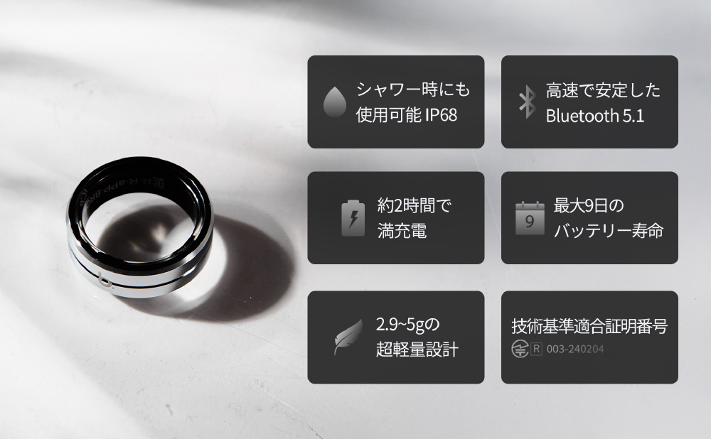 重さわずか約3g〜5g、指にはめるだけで健康状態をリアルタイムで計測できます。