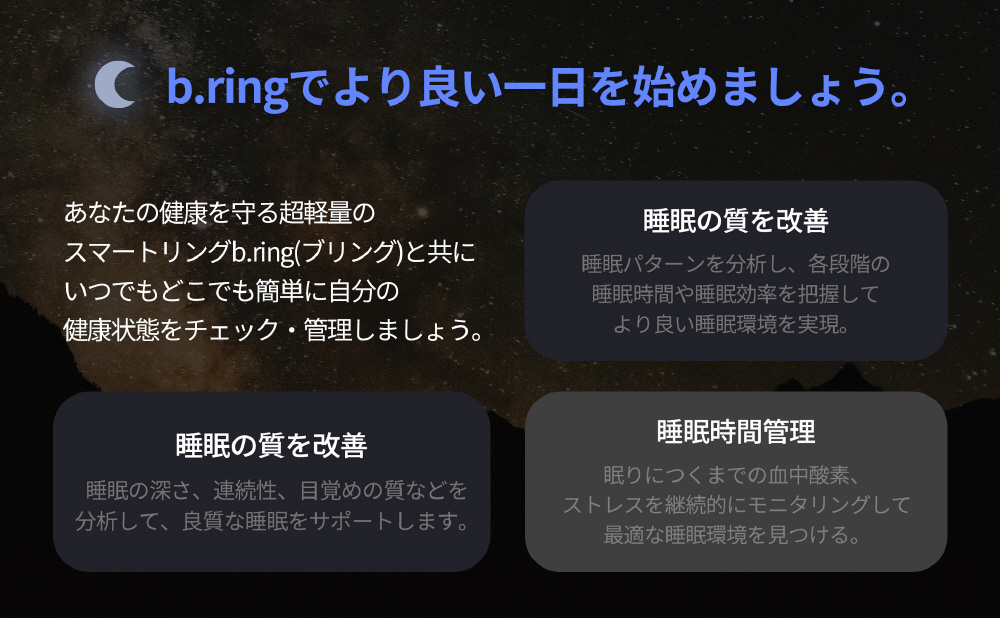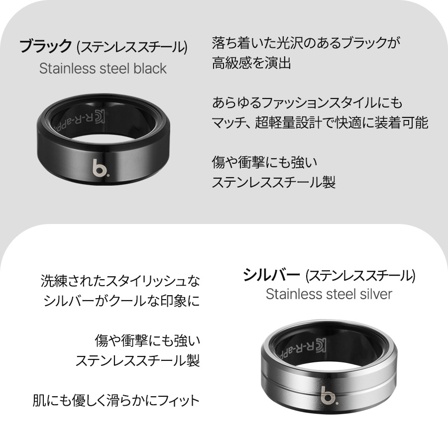 ・b.ringは、つけてるだけで生体情報を分析し毎日の健康をサポートするスマートリングです。日常生活に最適な着け心地とスタイリッシュなデザインが特徴です。