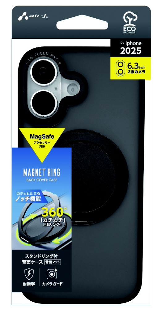 iPhone2025 秋 6.3インチ 2眼 Magsafe対応カチカチ回転リングスタンドクリアケース BK