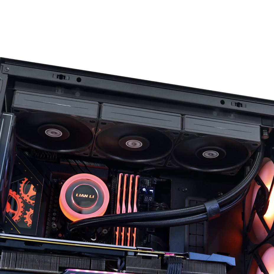CPUヘッドはGalahad II Trinityシリーズ譲りのインフィニティミラーを備えた水冷ヘッドで多層的な照明効果をもたらします。冷却ファンもLIAN LI製水冷ユニットの特徴でもあるデイジチェーン形式で接続された冷却ファンにより、ラジエーターを効果的に冷却しながら、ケーブル接続が簡単でシームレスな視界を実現します。