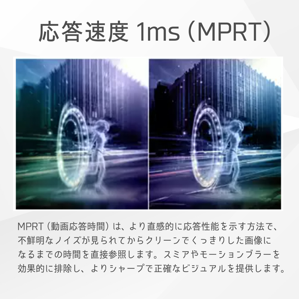 MPRT(動画応答時間)は、より直観的に応答性能を示す方法で、不鮮明なノイズが見られてからクリーンでくっきりした画像になるまでの時間を指します。
