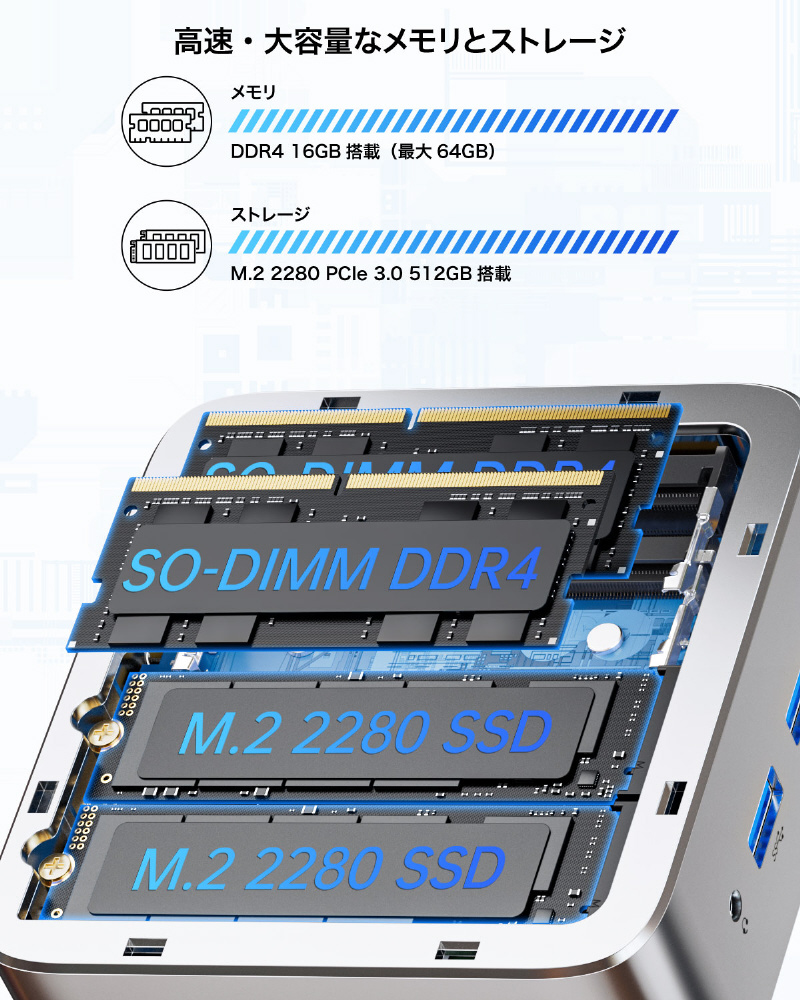 4コア8スレッド、最大3.7 GHz動作の高性能CPUと最大16 GBの大容量メインメモリ、最大512 GBのM.2 PCIe 3.0 高速SSDを搭載することで画像編集なども快適に行えます。