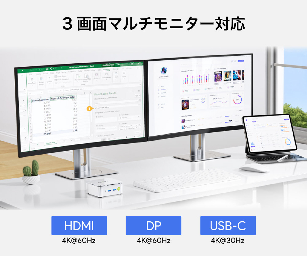 HDMI、DisplayPort、USB-C端子により最大3画面同時出力に対応し、在宅ワークやリビングPCなどに最適です