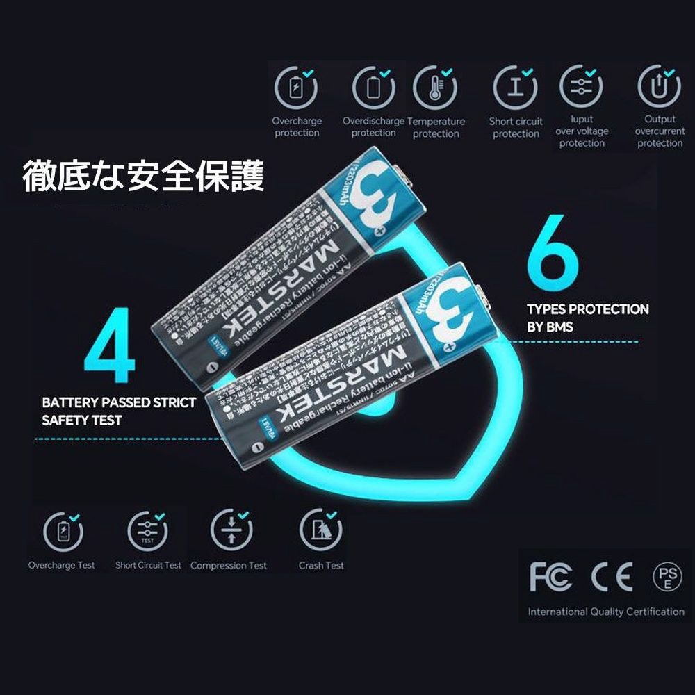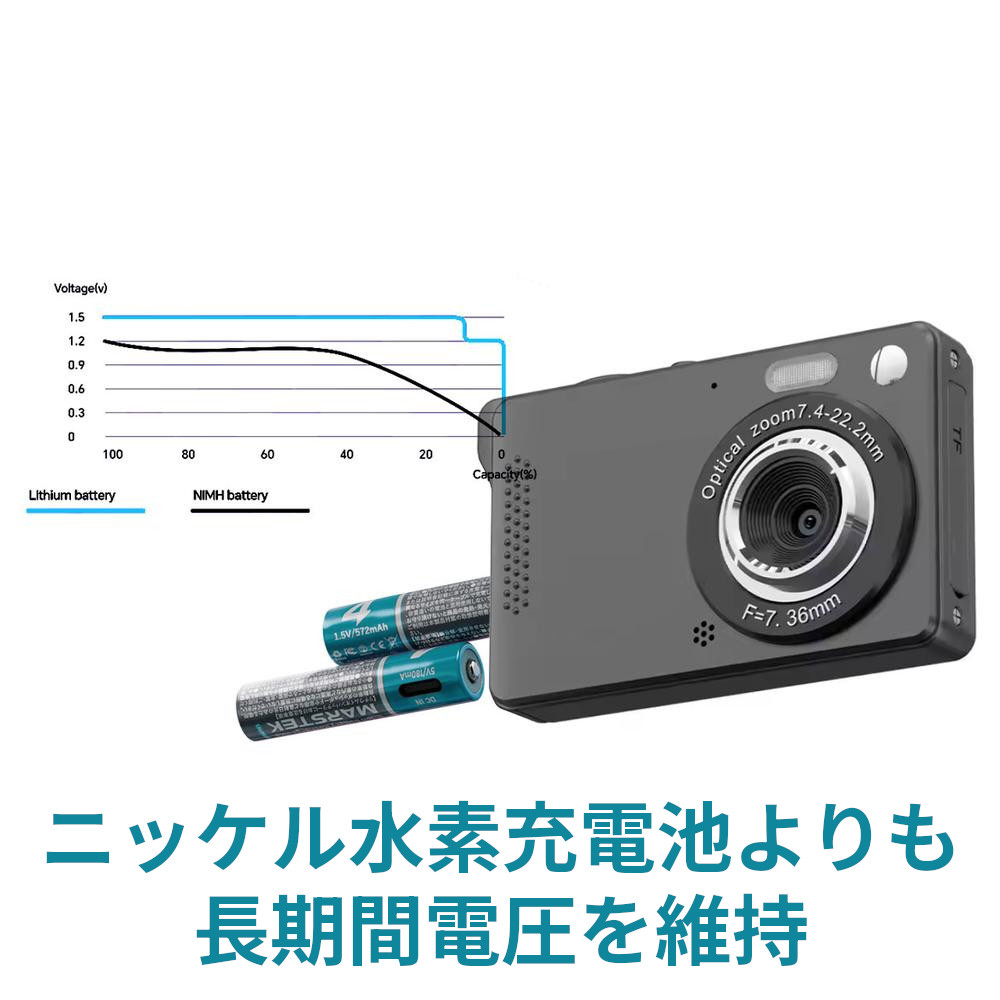 単3形状の1.5V出力リチウムイオン充電池。『繰り返し1500回以上の高耐久』『液漏防止設計』。安定電圧と大容量で、アルカリ・ニッケル水素電池からの置き換えに最適です。