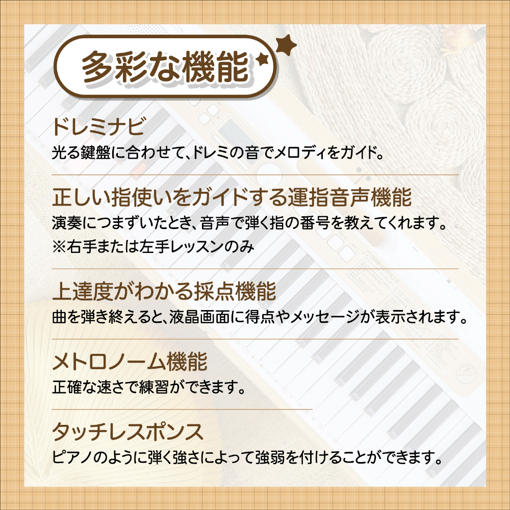 光ナビゲーション キーボード。どの鍵盤を弾いても正しいメロディが弾けるらくらくモード。マイクも付いて楽しく歌える!