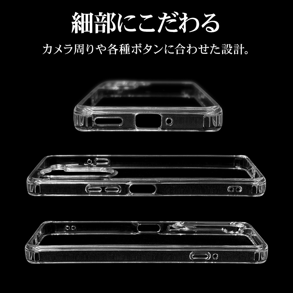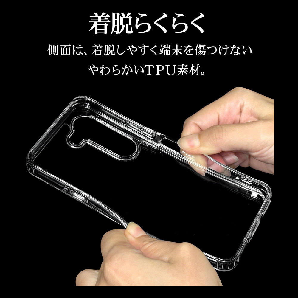 ●側面は弾力と柔軟性を兼ね備えたTPU素材で端末を衝撃から保護し、着脱も簡単です。※衝撃吸収については、一般的なポリカーボネート製ケースと比較した自社検証結果で、無破損、無故障を保証するものではありません。