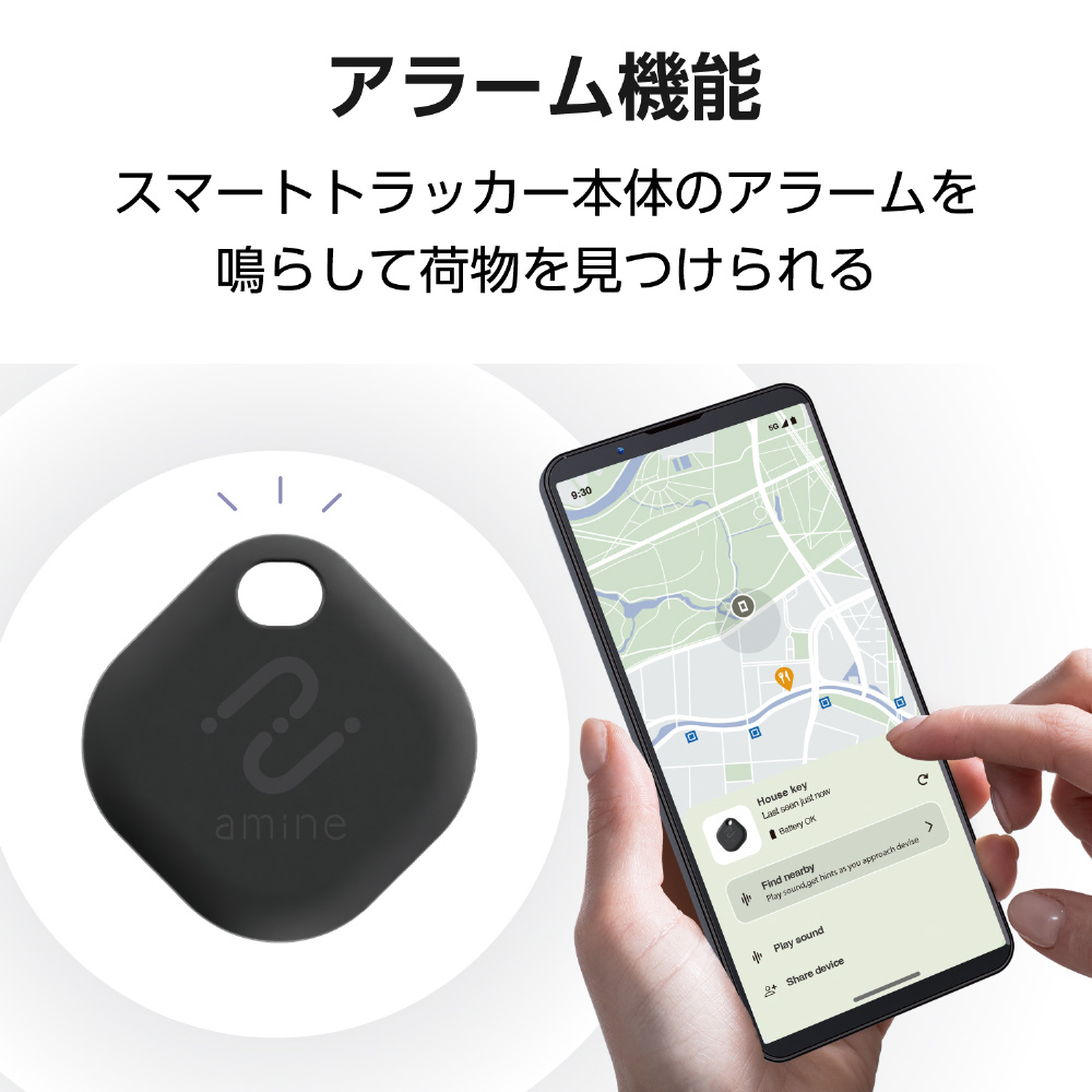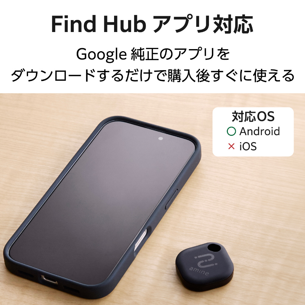 Android(TM)の「Find Hub」アプリから位置を確認!鍵や財布、かばんなど大切な荷物に付けて位置情報を追跡できるamine(あみね)シリーズの忘れ物防止タグです。激しい雨に濡れても安心の防水・防塵等級IP65だから、多彩なシーンで活躍。重さはたったの8.2gだからキーホルダー感覚で付けられます。