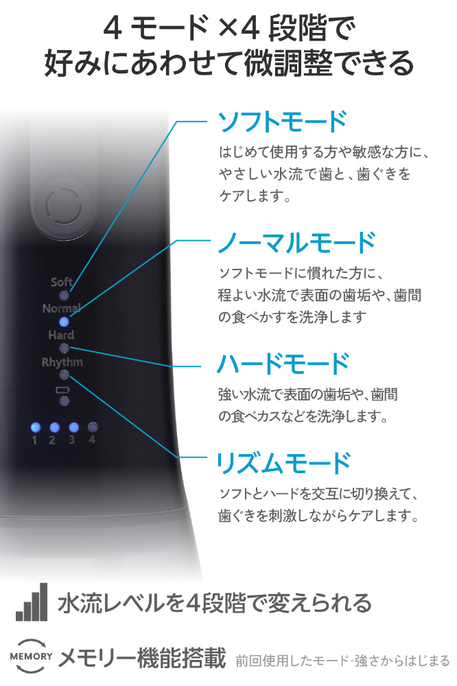 ■水の力で口内の磨き残しを洗浄。最大毎分2000回のパルスジェット水流は、4種類のモードを選んで使えます。勢いやリズムを調整しながら好みに合わせてお手入れ可能です。