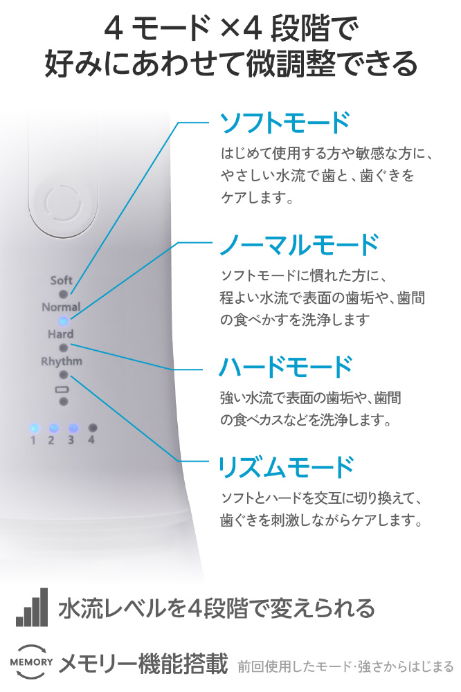 ノーマルモード:ソフトモードに慣れた方に。程よい水流で、表面の歯垢や歯間の食べカスを洗浄します。