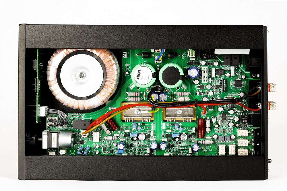 出力 50W + 50W (8 ohm) 大出力を達成する強力電源回路、160VA 大型トロイダルトランスを搭載、さらに、10,000μFコンデンサー大型コンデンサーx2を出力段に、2,200μFコンデンサーを入力段に採用されており、電源供給はパワー段、プリ段に分けて供給されています。