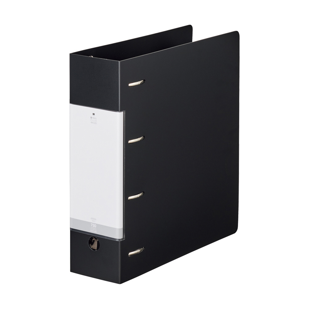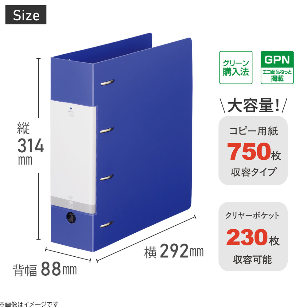 4穴のD型リングファイルから、コピー用紙750枚収容タイプが新登場!表紙にはファイルのゆがみを防ぐセーフティストッパーと交換式背見出しが付いております。表紙裏には名刺も入る三角ポケット付き。大きめの表紙サイズで、A4サイズのクリヤーポケットをとじても表紙からポケットがはみ出しません。4穴のD型リングと書類をしっかり押さえる樹脂製の紙押さえで、ファイルを立てても書類やクリヤーポケットが垂れません。