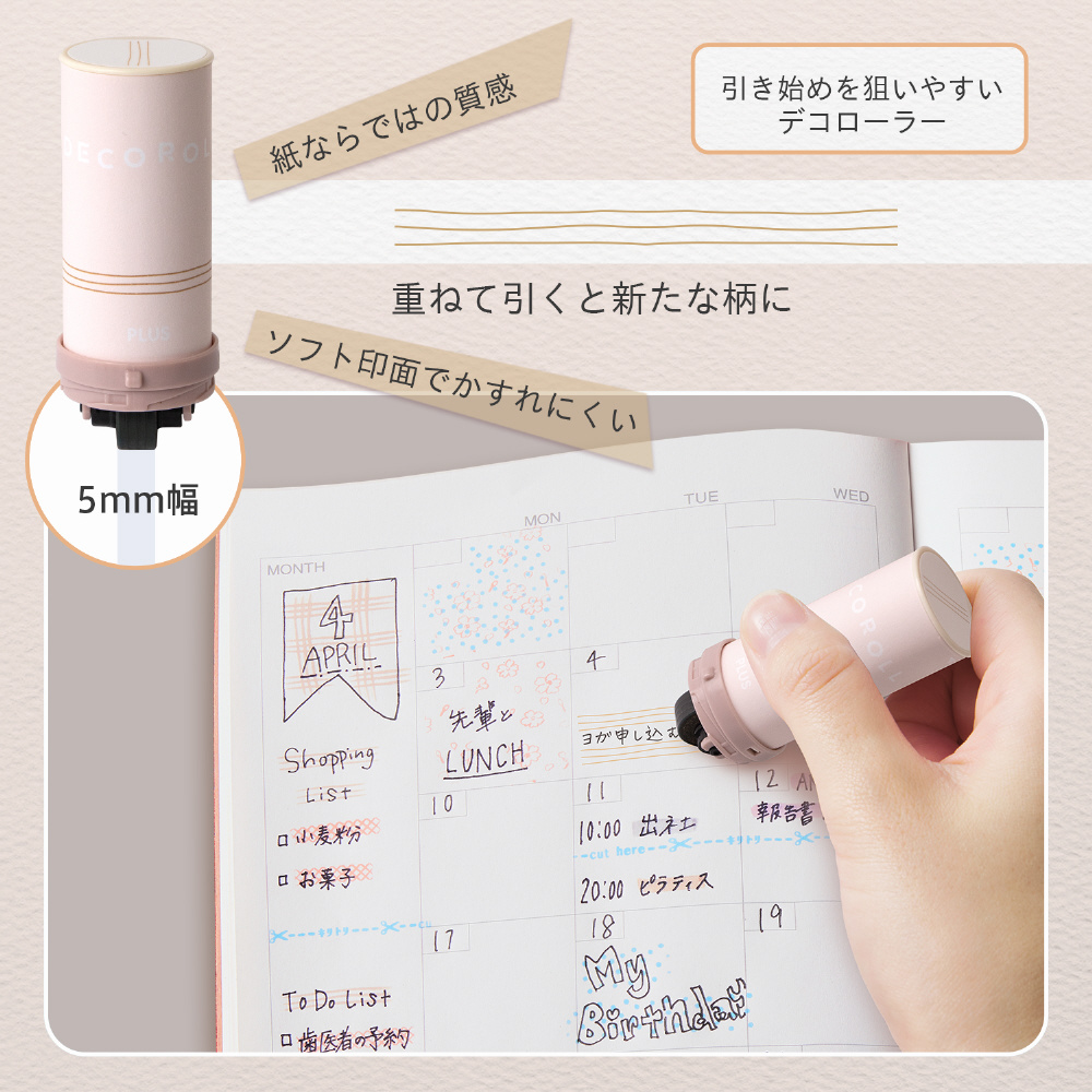 手帳やカードのデコレーションにぴったりな、デコレーションローラースタンプ「デコロール」は、淡いインクカラーで、手帳やカードを優しい色で彩ります。裏抜けしにくいインクを搭載。インクが淡い色なので、上から文字を書いたり他の柄と組み合わせて使えて自分だけのオリジナルデコが楽しめます。