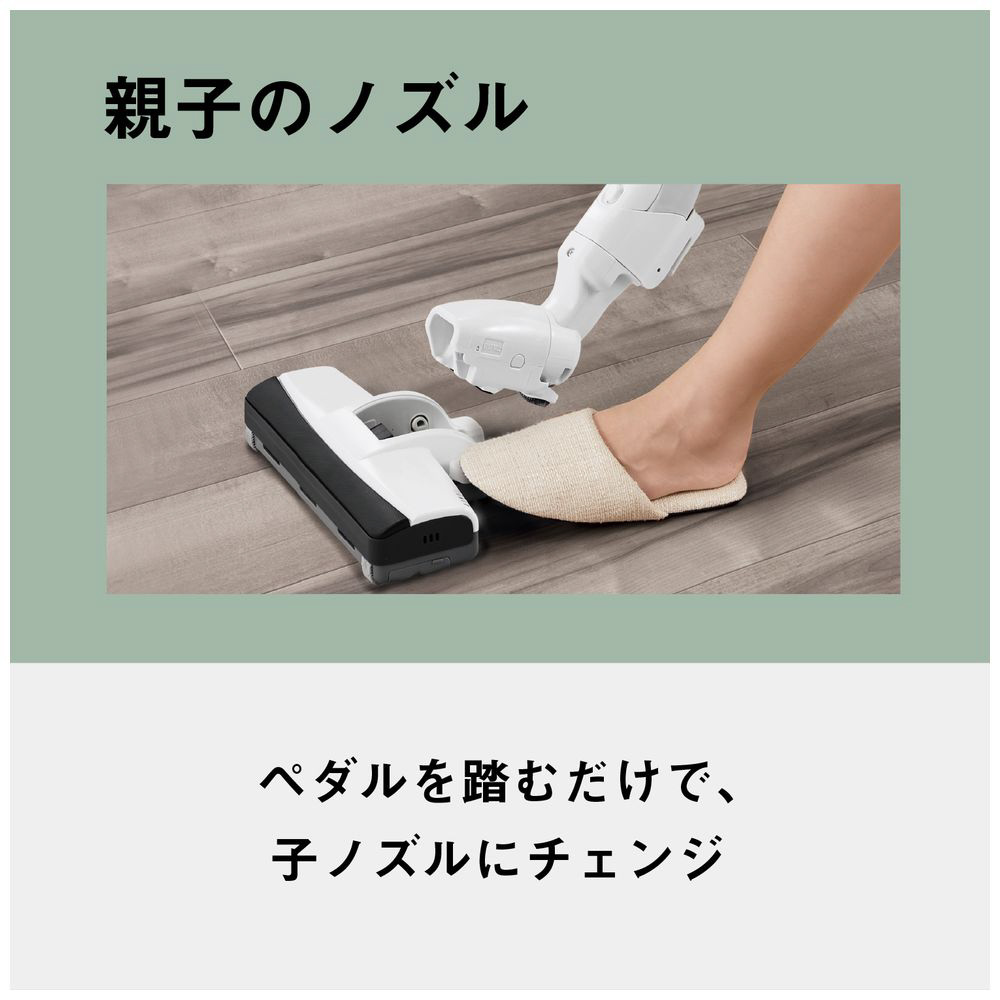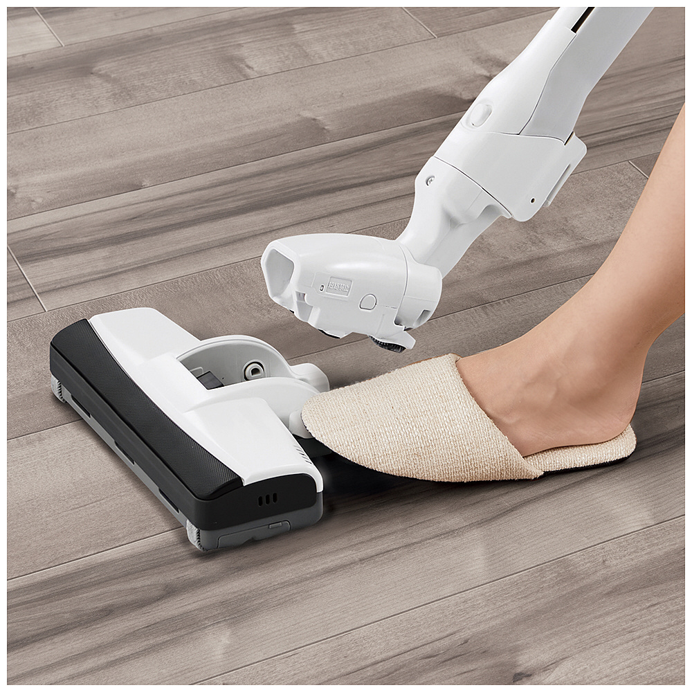 ペダルをポンと踏むだけで、子ノズルにチェンジ。狭いすき間や高いところなど、届きにくい場所を気軽にお掃除できます。