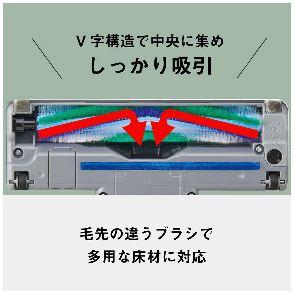 独自のV字型の構造で、吸引力の強いブラシの中央にゴミを集め取り残しを防ぎます。