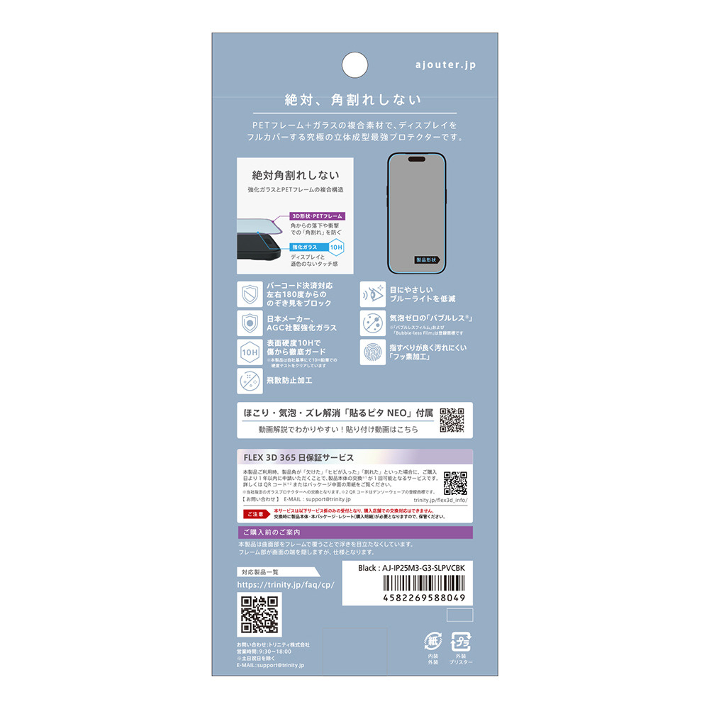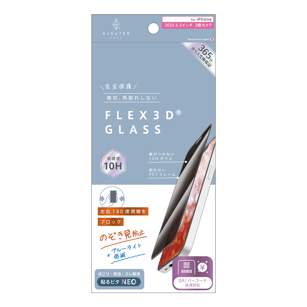 | 商品名 | iPhone 17 Pro 3眼フィルム ajouter アジュテ [FLEX 3D] のぞき見防止 複合フレームガラス ブラック AJ-IP25M3-G3-SLPVCBK |