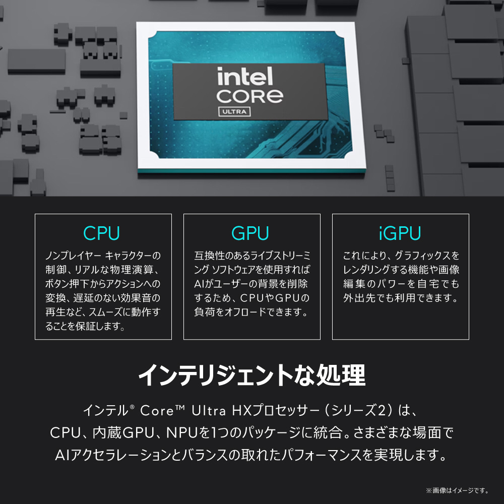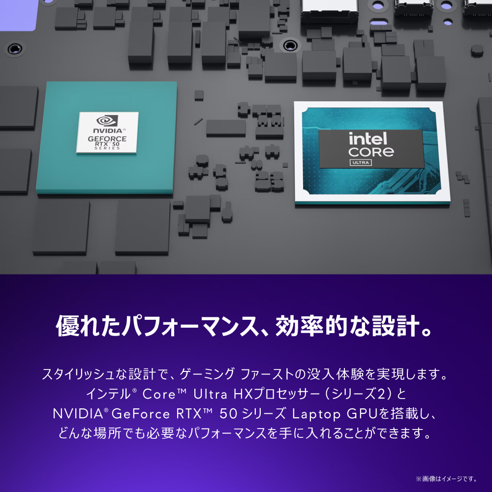 夢中になれる、圧倒的なパフォーマンス。インテル Core Ultra プロセッサーを搭載し、最適化されたパフォーマンスを発揮するスタイリッシュなデザインのゲーミング パソコン。WQXGA 240Hz 500ニットのディスプレイに、カバーと底面にはアルマイト処理されたアルミニウムを採用。