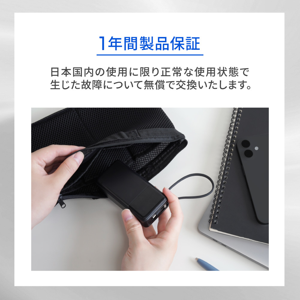 USB Type-Cケーブル一体型 10000mAh 最大PD30W対応 USB Type-C入出力 USB Type-A出力 モバイルバッテリー