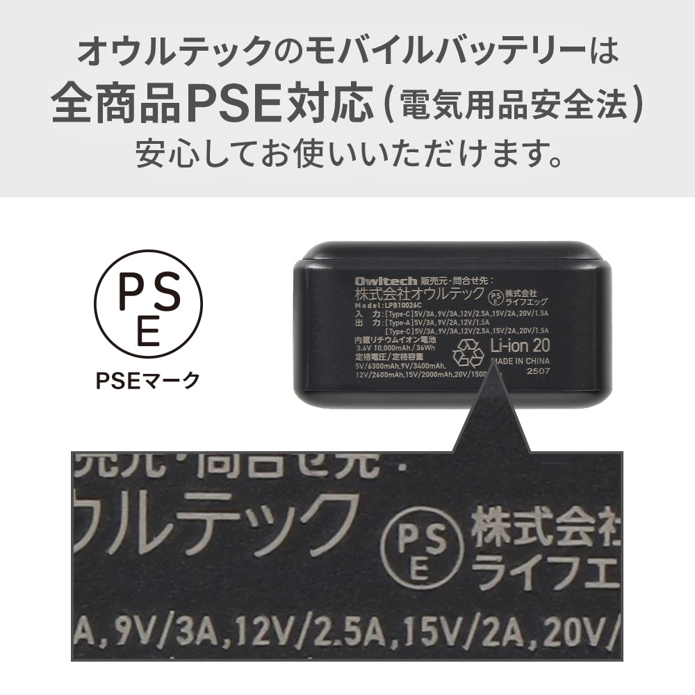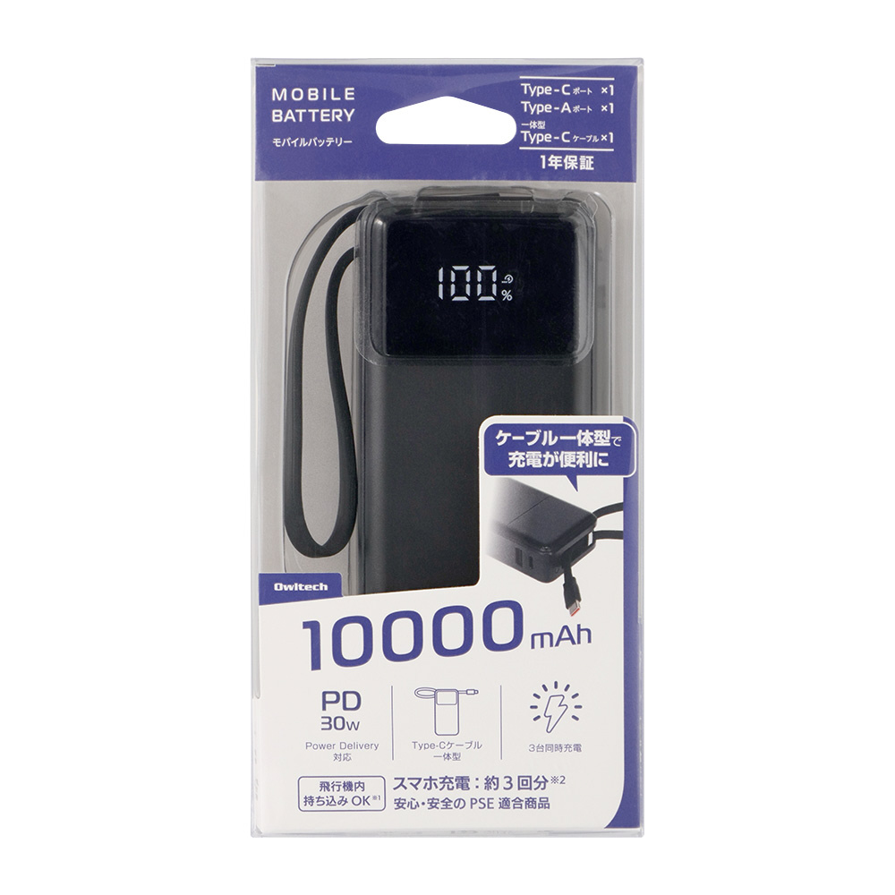 USB Type-Cケーブル一体型 10000mAh 最大PD30W対応 USB Type-C入出力 USB Type-A出力 モバイルバッテリー ブラック OWL-LPB10026C-BK [USB Power Delivery対応]