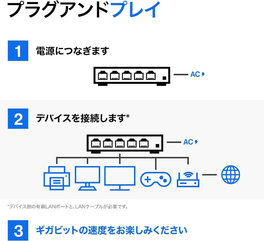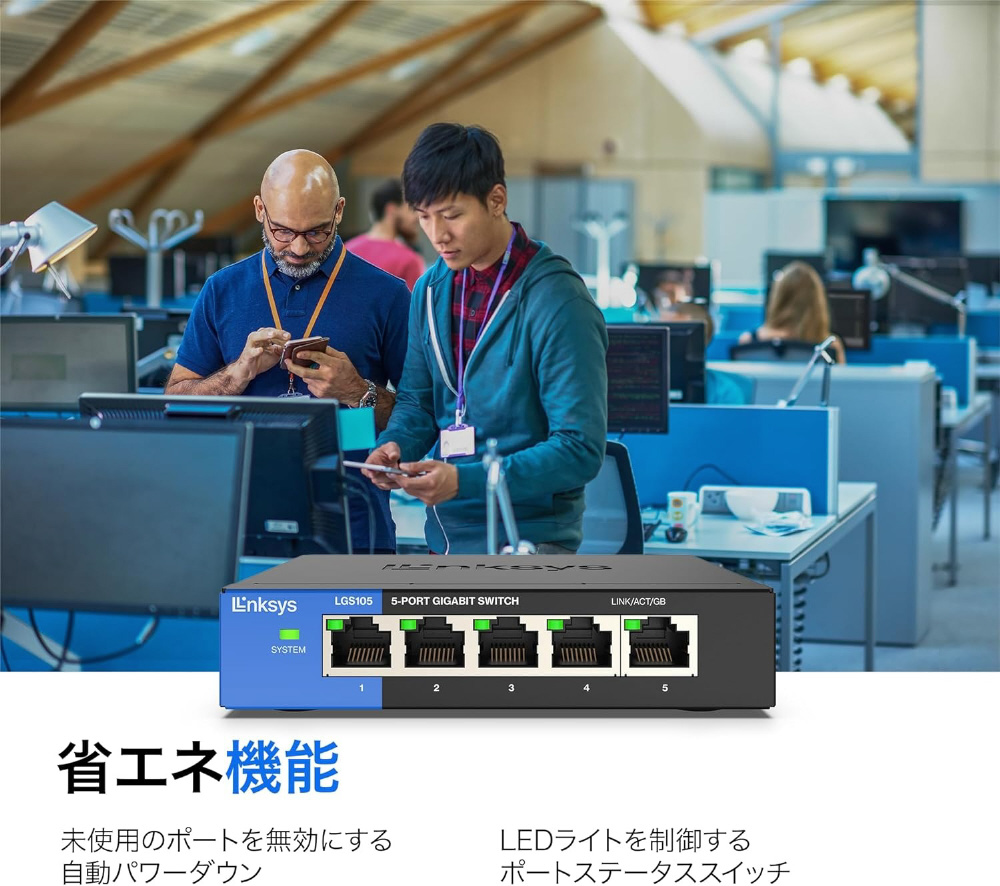 | 仕様1 | [イーサネット] ギガビットイーサネット×5 [スイッチタイプ]アンマネージド [対応規格・プロトコル] IEEE 802.1p(Class of Service) IEEE 802.3(Ethernet) IEEE 802.3u(100BASE-TX) IEEE 802.3x(Full-duplex flow control) IEEE 802.3ab(1000BASE-T) IEEE 802.3az(Energy-Efficient Ethernet) |