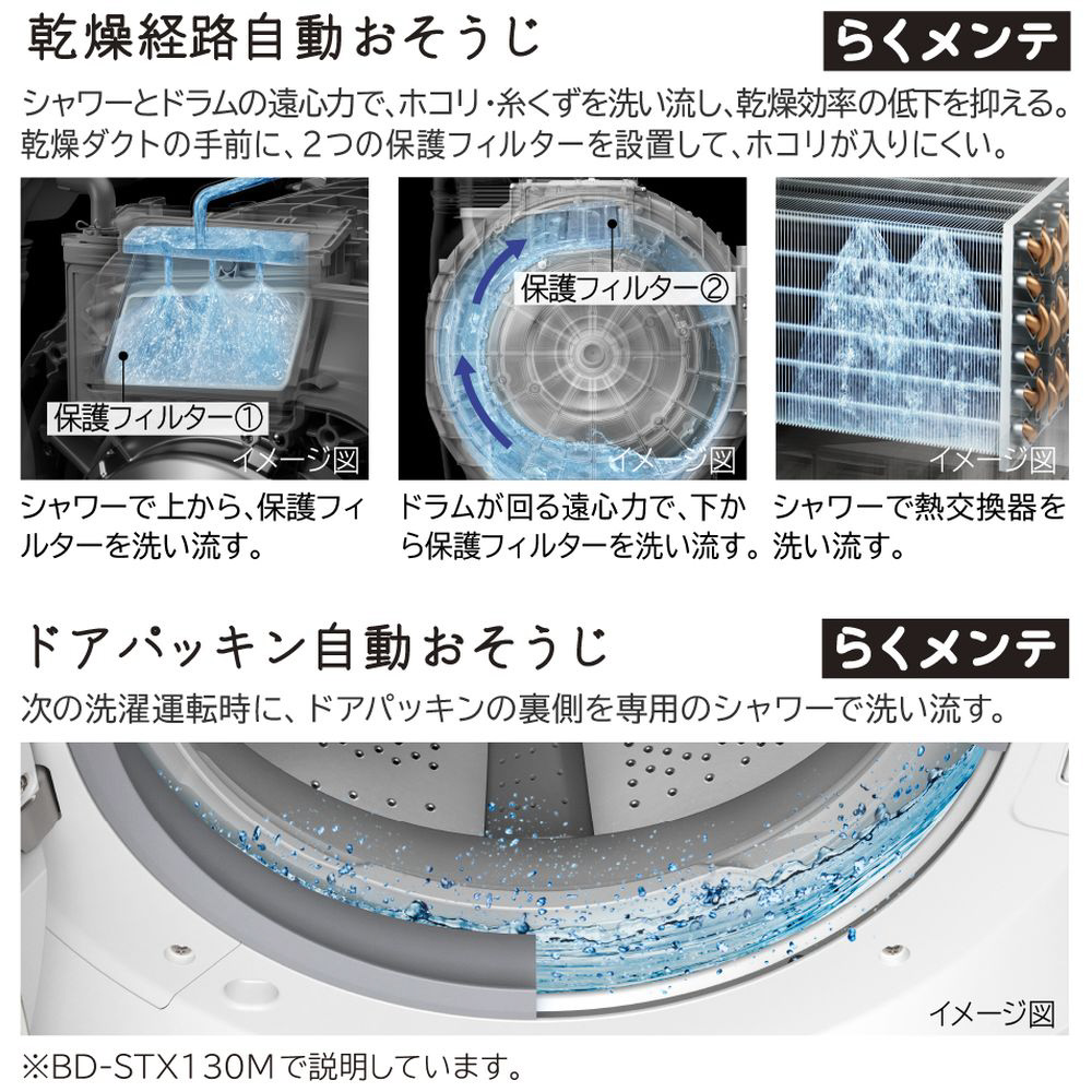 面倒だった乾燥フィルターのお手入れは不要になりました。乾燥時のホコリや糸くずは、次の洗濯運転時に、3つの自動おそうじ機能で洗い流して、[大容量糸くずフィルター]で捕集します。お手入れがしやすいラウンド形状で、お手入れの頻度は約2週間に1回でOK(※1)。また、洗濯槽・乾燥経路・ドアパッキンの3つを強力洗浄する「らくメンテ洗浄」コース(槽洗浄4時間)も搭載しています(※2)。