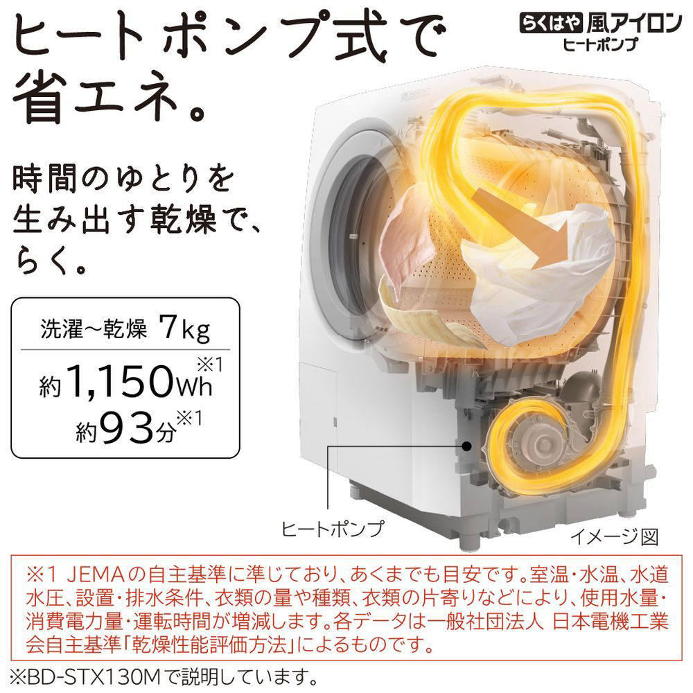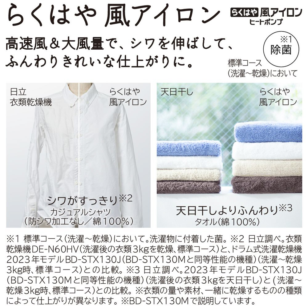 高速風と大風量で、シワを伸ばす力はそのままにヒートポンプ式で、時短と省エネの両立を実現しています。また、手前から衣類に直接風を当てる日立の特許技術により、風が遮られず、袖まできれいに仕上げます。さらに、衣類温度約65℃の(※)低温乾燥で、ふんわりやさしく仕上げます。
