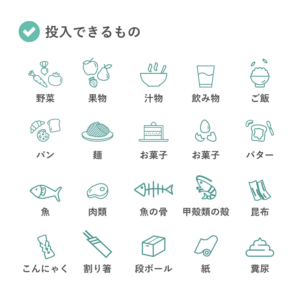 投入したごみは空気と水に分解され、残りが堆肥となります。家庭菜園などの肥料としてお使いいただくか燃えるゴミとして処分いただけます。投入したゴミを毎回取り出す必要はなく、機械一杯にたまったタイミング(約1カ月~)で処分していただく方式のため手間がほとんどかかりません。