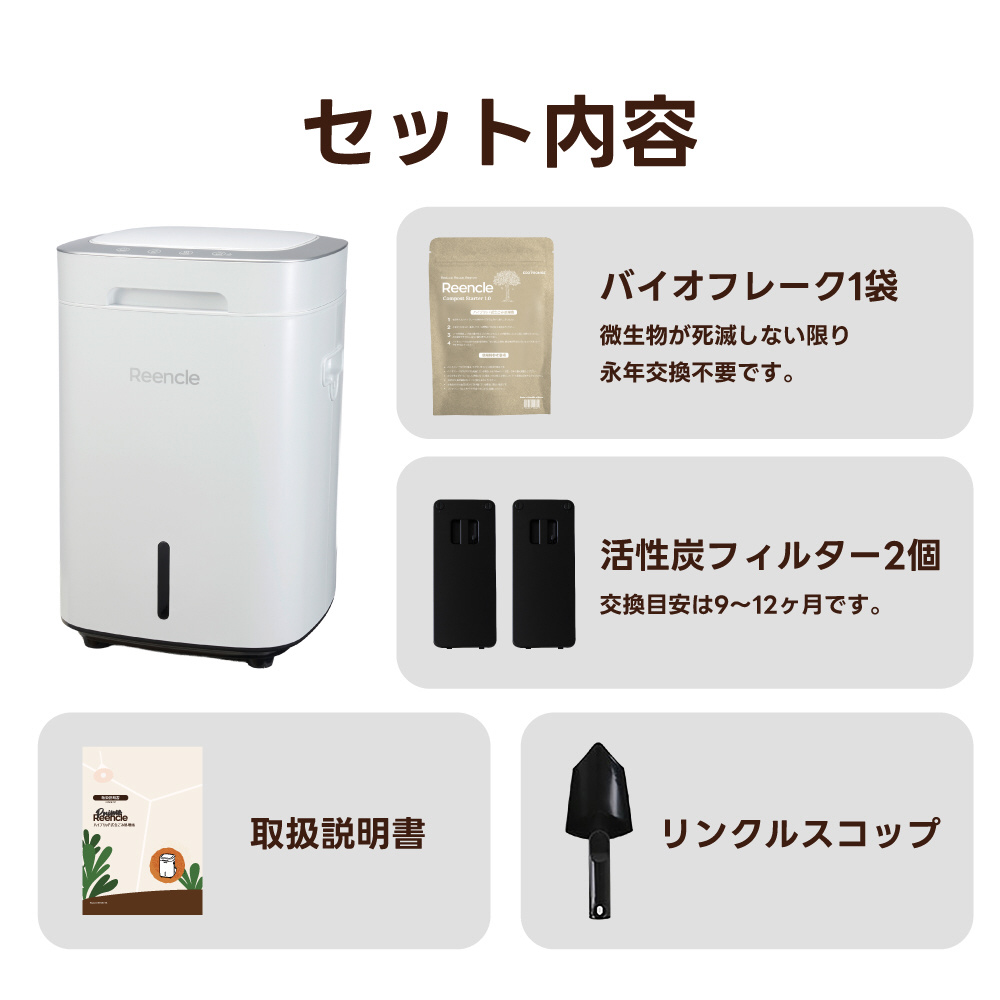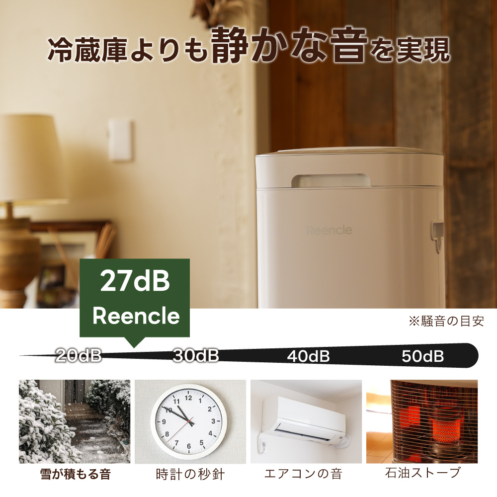 冷蔵庫よりも静かな処理音を実現しました。 乾燥式の生ごみ処理機は熱を加えて処理を行うため、処理中にモーターが発生します。Reencleの生ごみ処理機はハイブリッド式で内部の撹拌がゆっくりと回転しバイオの力で処理を行うため、処理音を大切にできます。