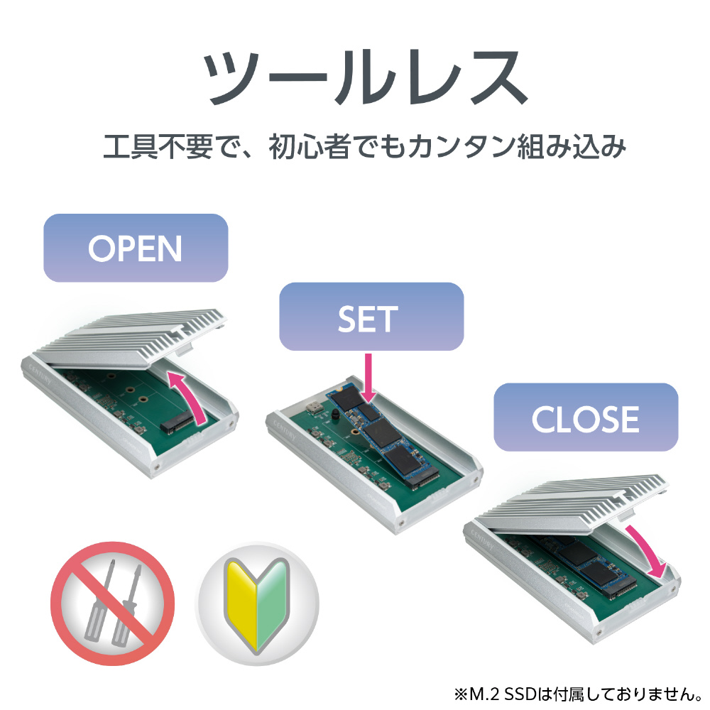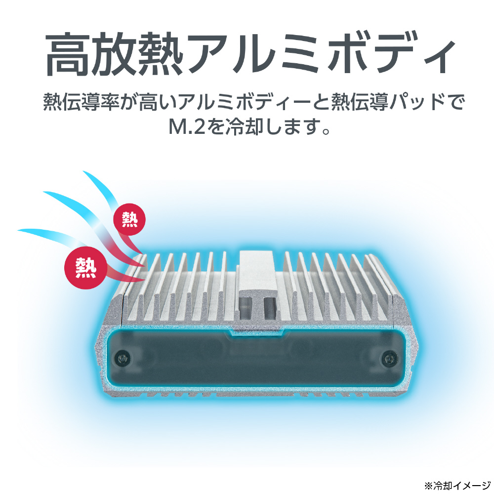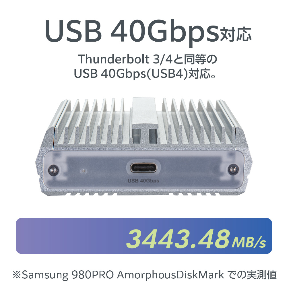スタイリッシュなシルバーボディ!USB 40Gbps対応でMacでも、Windowsでも高速転送できるM.2 NVMeケース