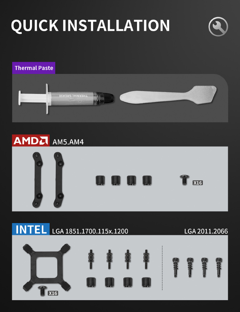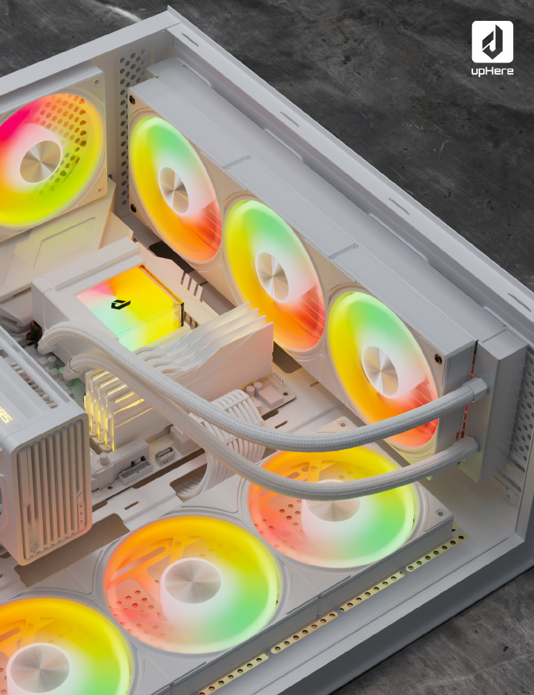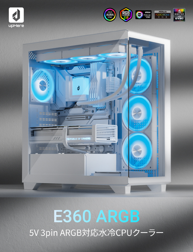 upHere E360 ARGB は、ARGB LEDを搭載した水冷一体型ユニットのCPUクーラーです。マグネット式のカバーで2つのデザインを切り替えられるポンプヘッドにRGB LEDを搭載し、高い冷却性能とユニークなイルミネーションを両立しています。主要マザーボードメーカーのRGB制御に対応し、360 mmのラジエータと3つのPWMファンでCPUの熱を素早く冷却し、システムの性能を最大限に引き出します。