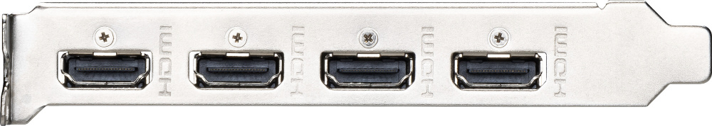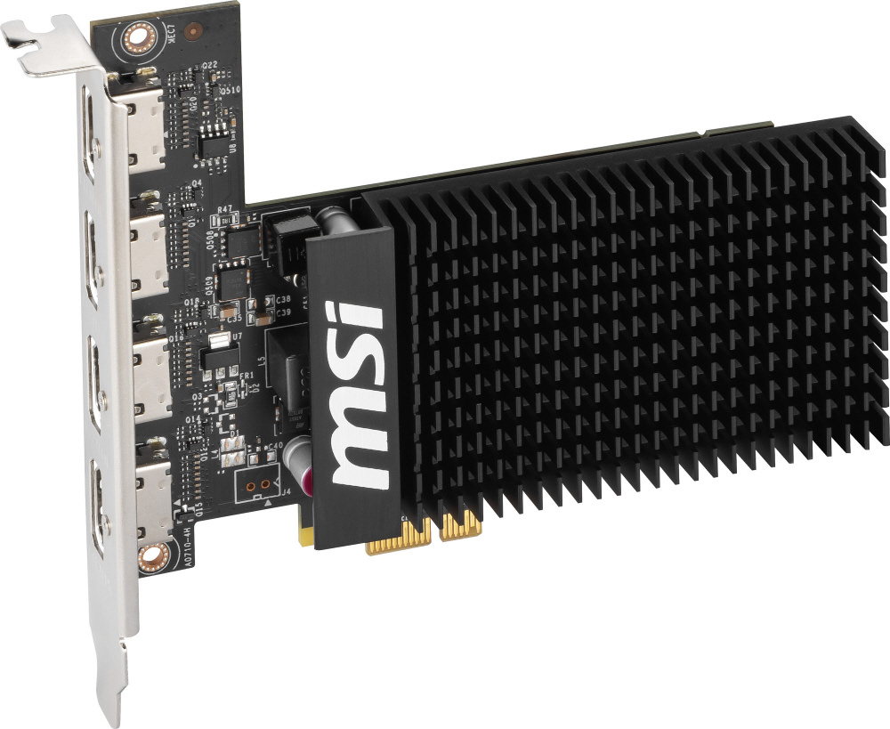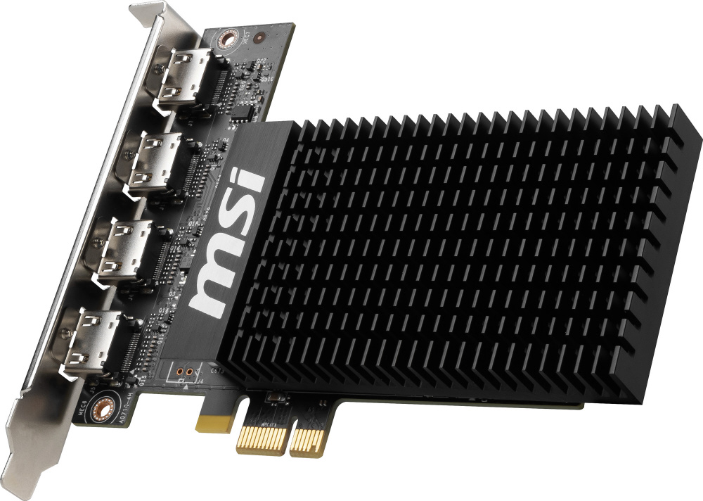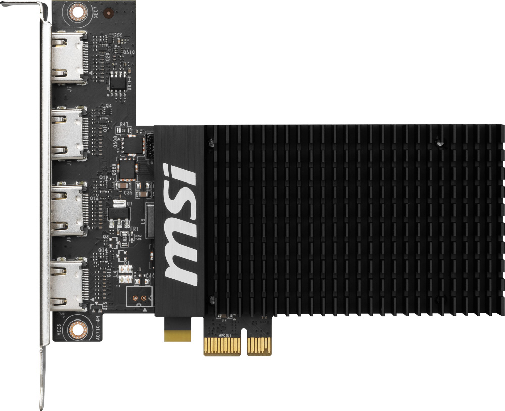 NVIDIA GeForce GT 710を搭載。ファンレス設計のヒートシンクと4つのHDMI出力を備えたグラフィックボード
