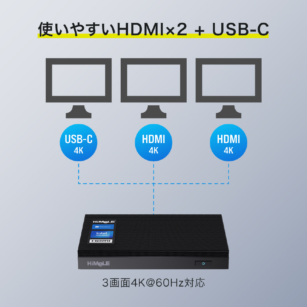 HiMeLE Quieter 4Cは、Intel Processor N150を搭載したファンレス極薄のミニPCです。わずか18.3 mmの薄さでありながら4コア4スレッド、最大3.6 GHz動作の高性能CPUと16 GBの大容量メインメモリ、512 GBのM.2 PCIe 3.0 高速SSDを搭載しています。HDMIとUSB-C端子を組み合わせて最大3画面同時出力が可能なため、最小限のスペースでマルチモニタ環境の構築にも対応します。