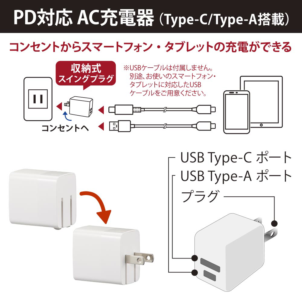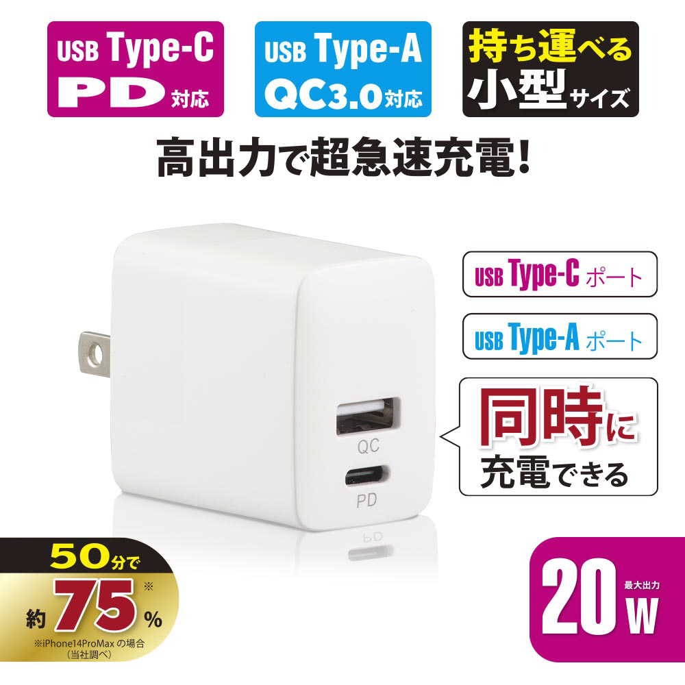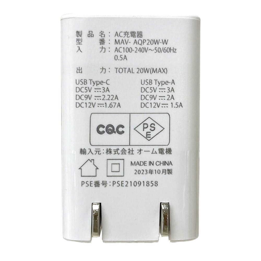 | 商品名 | AudioComm AC充電器 PD対応Type-C+QC対応Type-A AudioComm ホワイト MAV-AQP20W-W [2ポート /USB Power Delivery対応] |