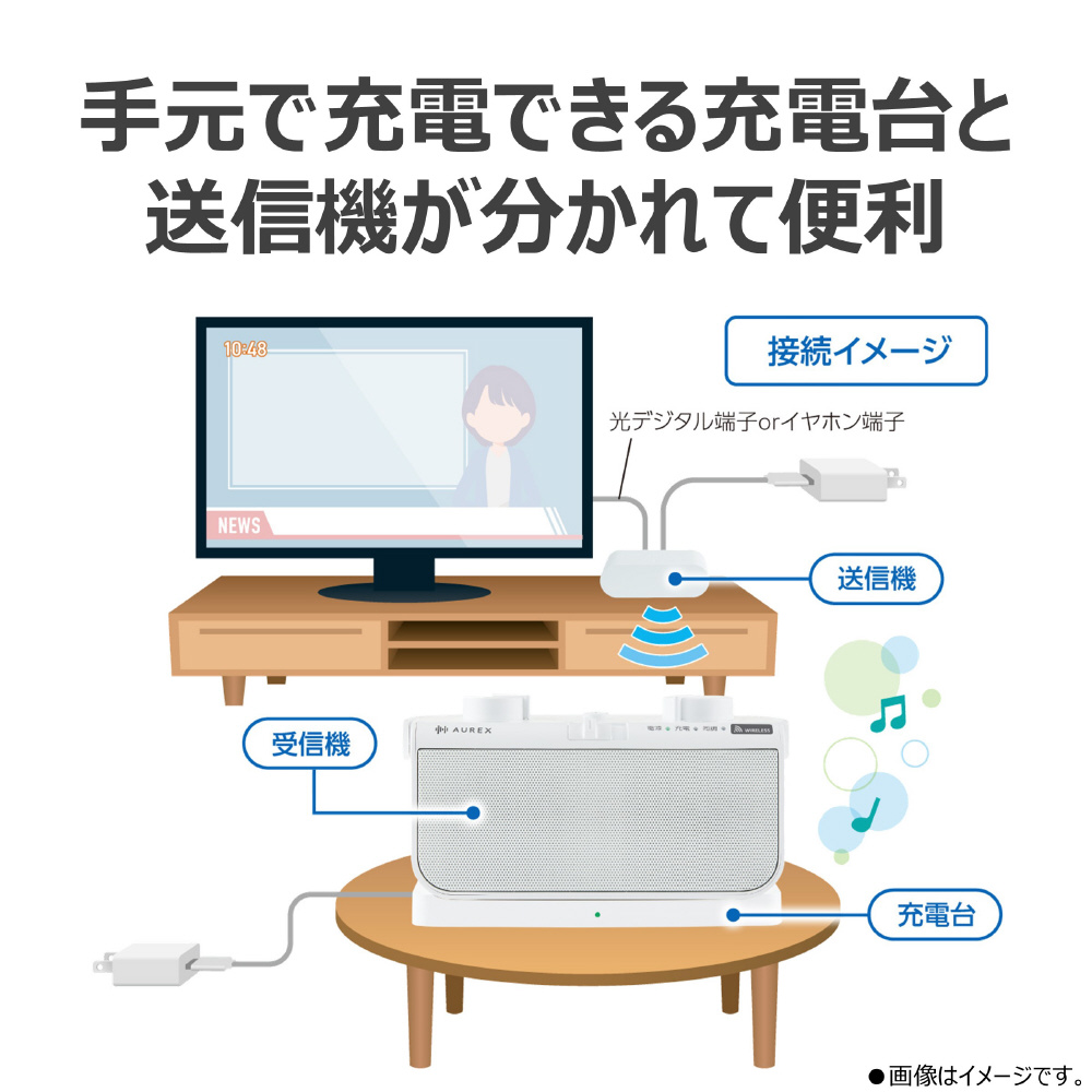 本機は、充電台と送信機が分かれているため、充電台をお好みの場所へ設置でき、充電の際に受信機本体(スピーカー)を、テレビ周りに戻す手間がありません。
